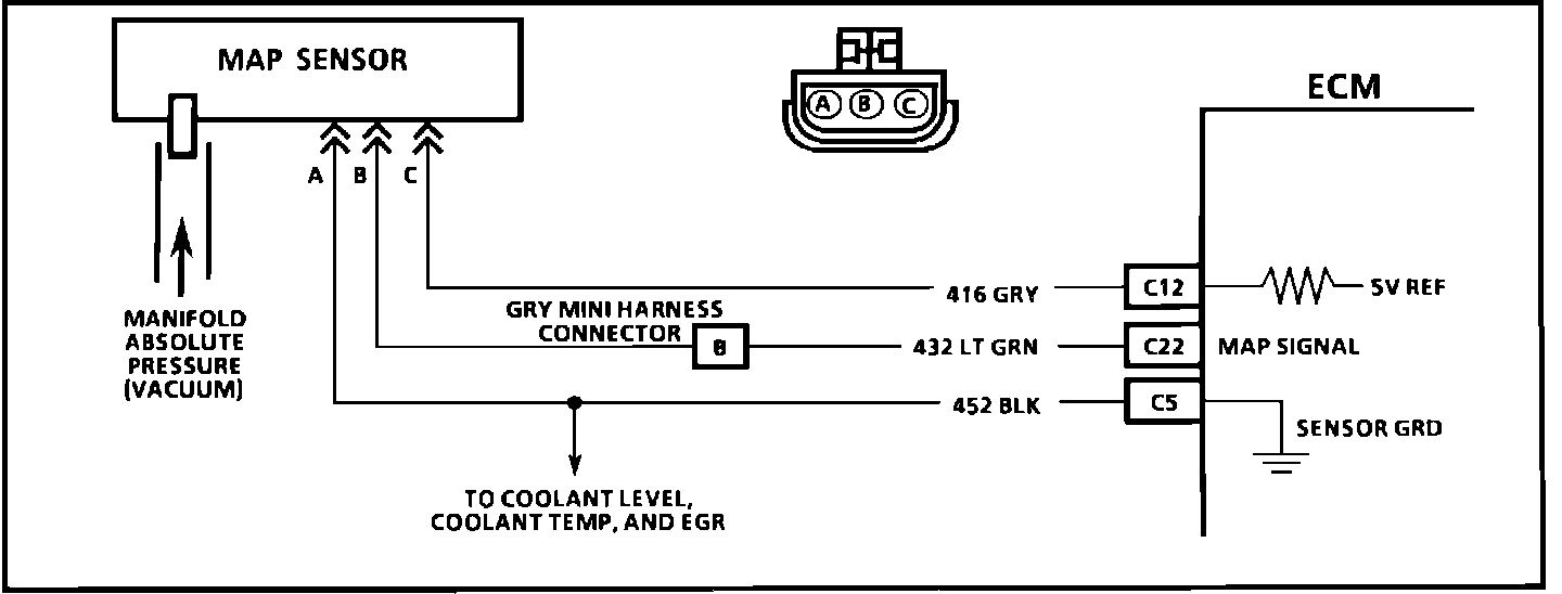 The manifold absolute pressure sensor (MAP) measures manifold pressure (vacuum) and sends that signal to the ECM. The MAP sensor is mainly used for fuel calculation, when the ECM is running in the throttle body backup mode. The MAP sensor is also used to determine the barometric pressure and to help calculate fuel delivery.