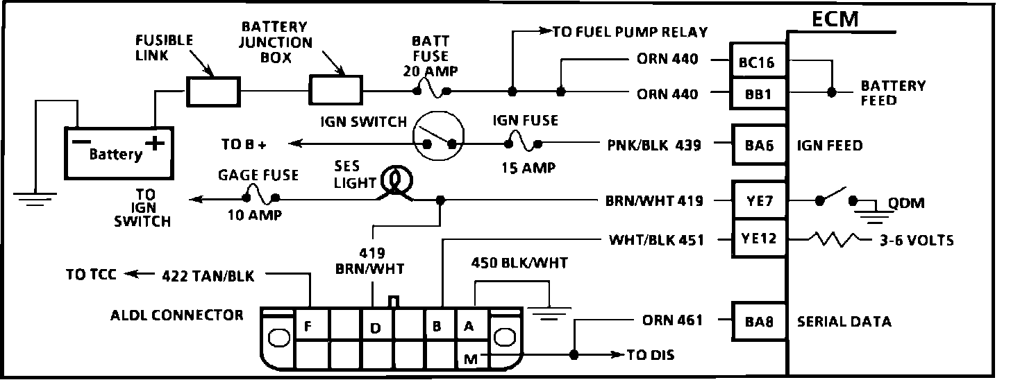 There should always be a steady "SERVICE ENGINE SOON" light when the ignition is "ON" and engine stopped. Ignition voltage is supplied to the light bulb. The ECM will control the light and turn it "ON" by providing a ground path through CKT 419.