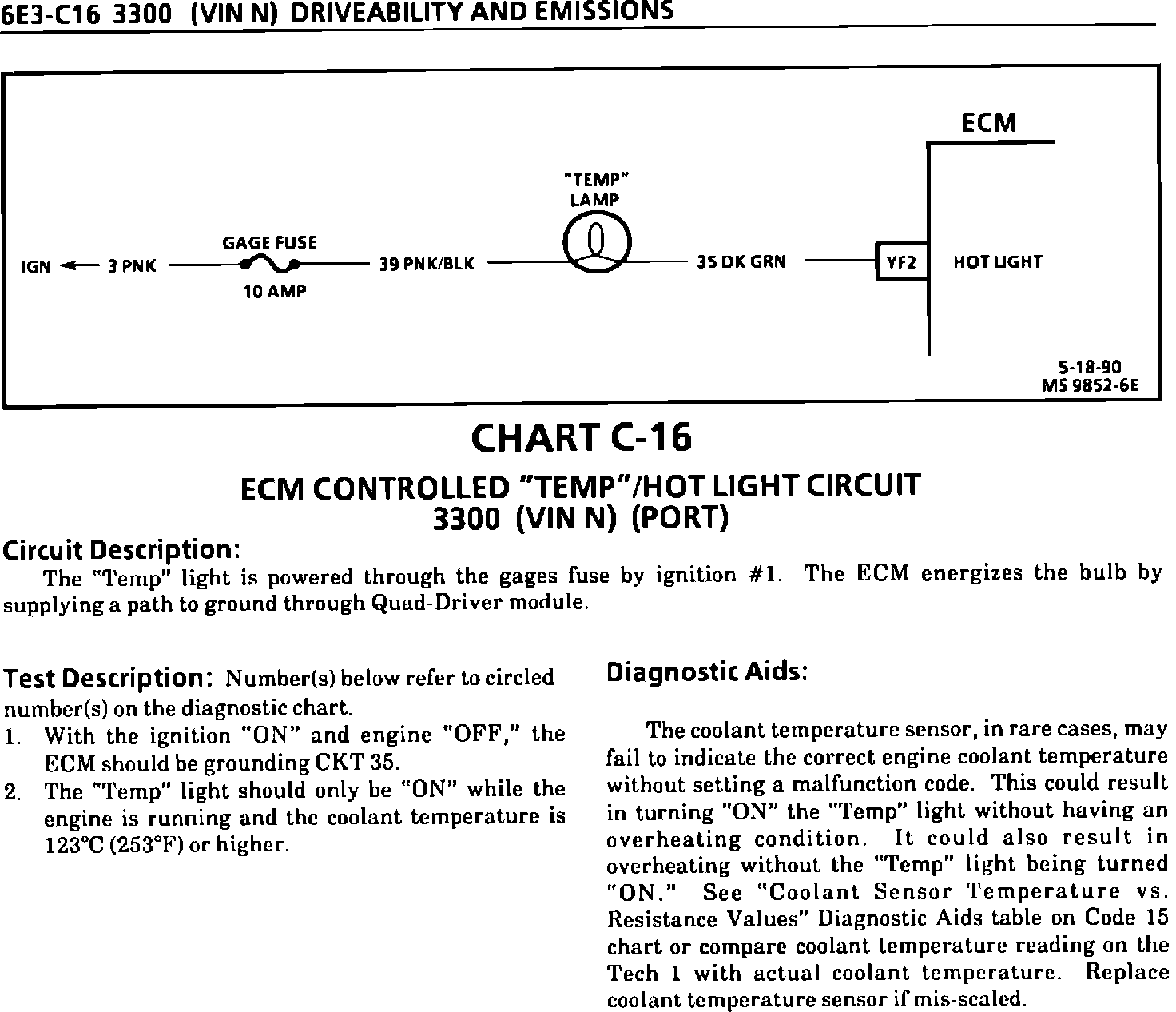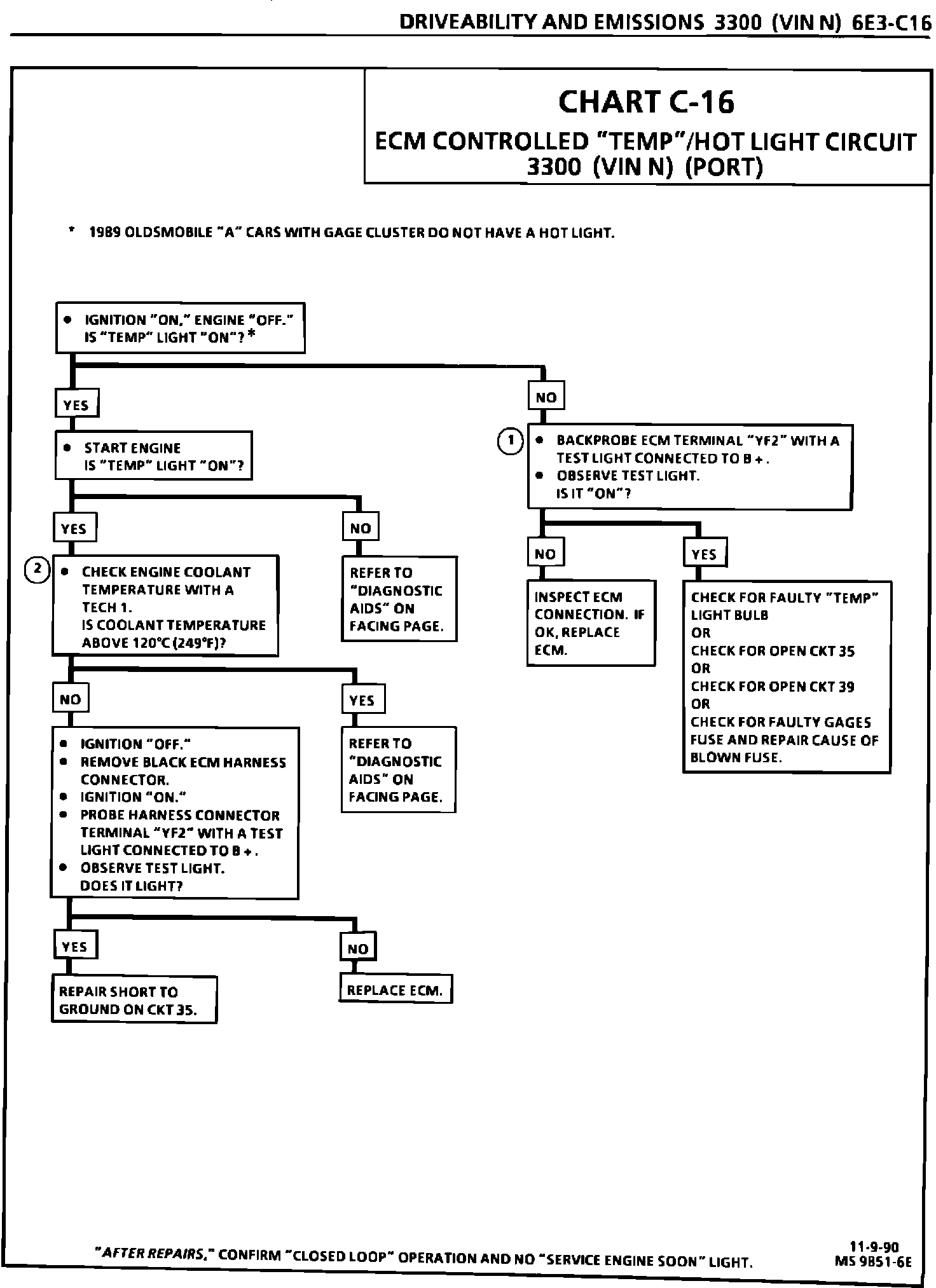The ECM Controlled Hot Light Chart C-16 was inadvertently omitted from Section 6E3 "Driveability And Emissions" for the 1989-91 Cutlass Ciera and the 1990 Cutlass Calais Service Manuals for vehicles equipped with a 3300 (VIN N) engine.