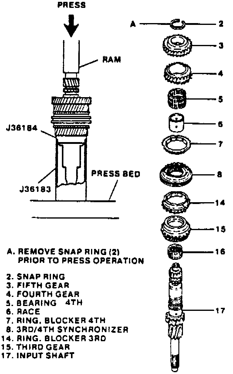 A hydraulic press, tools J-36183 and J-36184 are required to conduct the following procedure. Also, identify blocker ring (14) for the 3rd gear and blocker ring (7) for the 4th gear. Do not interchange the 3rd and 4th gear blocker rings.