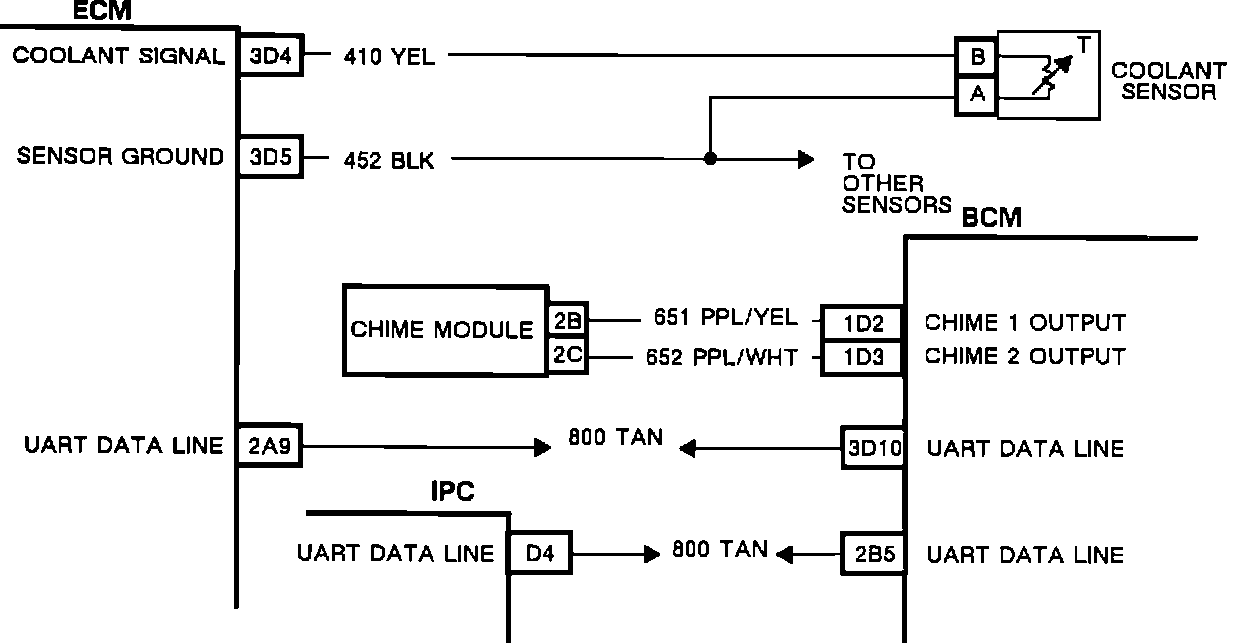 coolant temperature sensor circuit through pin 3D4. As the coolant temperature goes from cold to hot, the sensor's resistance goes from high to low, and the voltage level the ECM detects at pin 3D4 goes from high to low. Every 1.0 second, the BCM checks the ECM for the coolant temperature. If the calculated coolant temperature reaches 126°C (i.e. the voltage at pin 3D4 of the ECM drops low enough), and all other failure conditions are met, the IPC will cause the coolant temperature gauge bars to flash, and the BCM will activate the fast chime on the chime module.