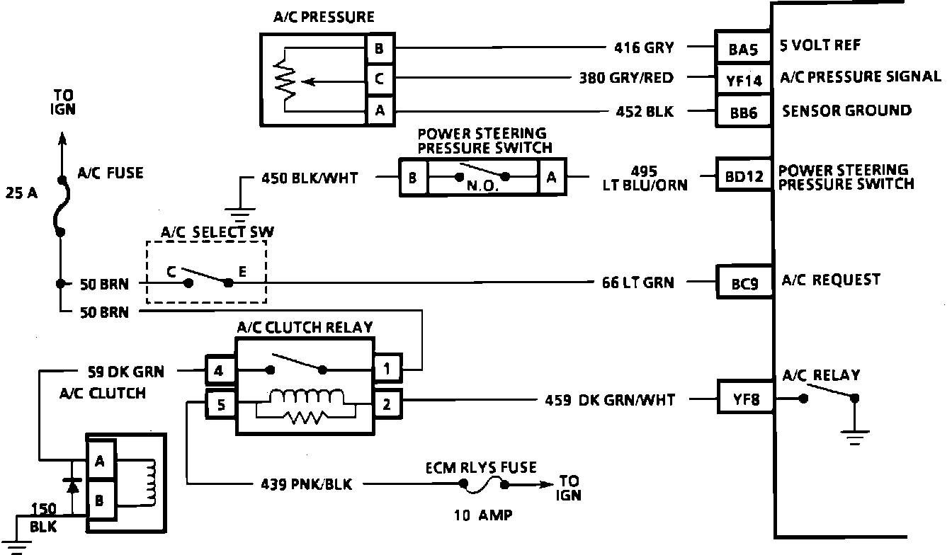 The A/C clutch control relay is energized when the ECM provides a ground path through CKT 459 and A/C is requested. A/C clutch is delayed about 0.3 seconds after A/C is requested. This will allow the IAC to adjust engine rpm for the additional load.