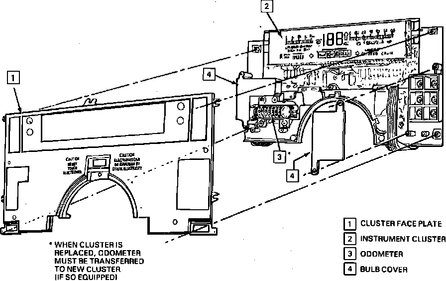 5. Remove instrument cluster to instrument panel attaching screws, then pull cluster assembly rearward, Figs. 28 through 30. On models with electronic instrument cluster, note warning printed on front of cluster and do not touch electronic components as static electricity may damage components.