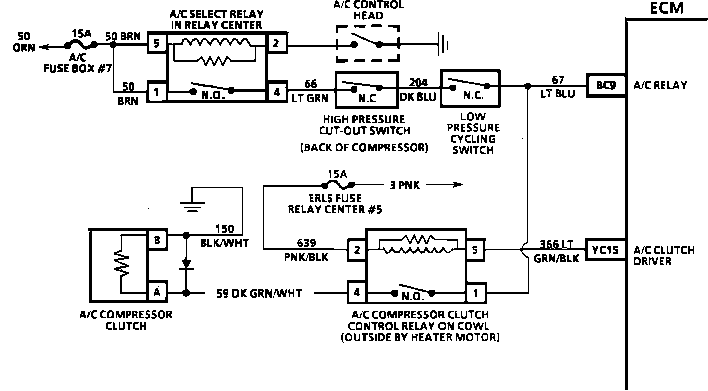 The ECM controls the A/C compressor clutch relay. When the A/C is turned on, the ECM delays the clutch engagement of the A/C compressor to allow the IAC valve to raise the engine idle speed to compensate for the added load. The ECM also causes the relay to disengage the A/C clutch at wide open throttle, high pressure power steering pump loads and when the engine is overheating.