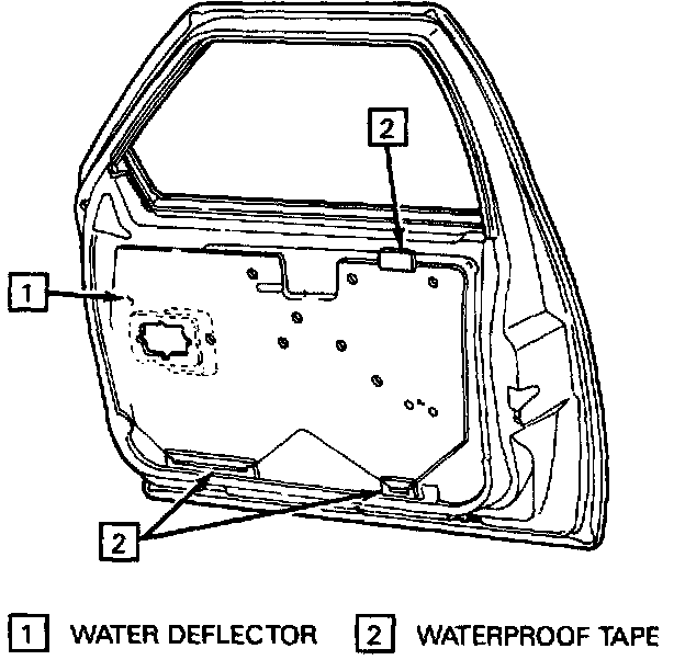 1. Water deflector to door inner panel, making sure the tabs on bottom of deflector are in clots in bottom of door inner panel.
