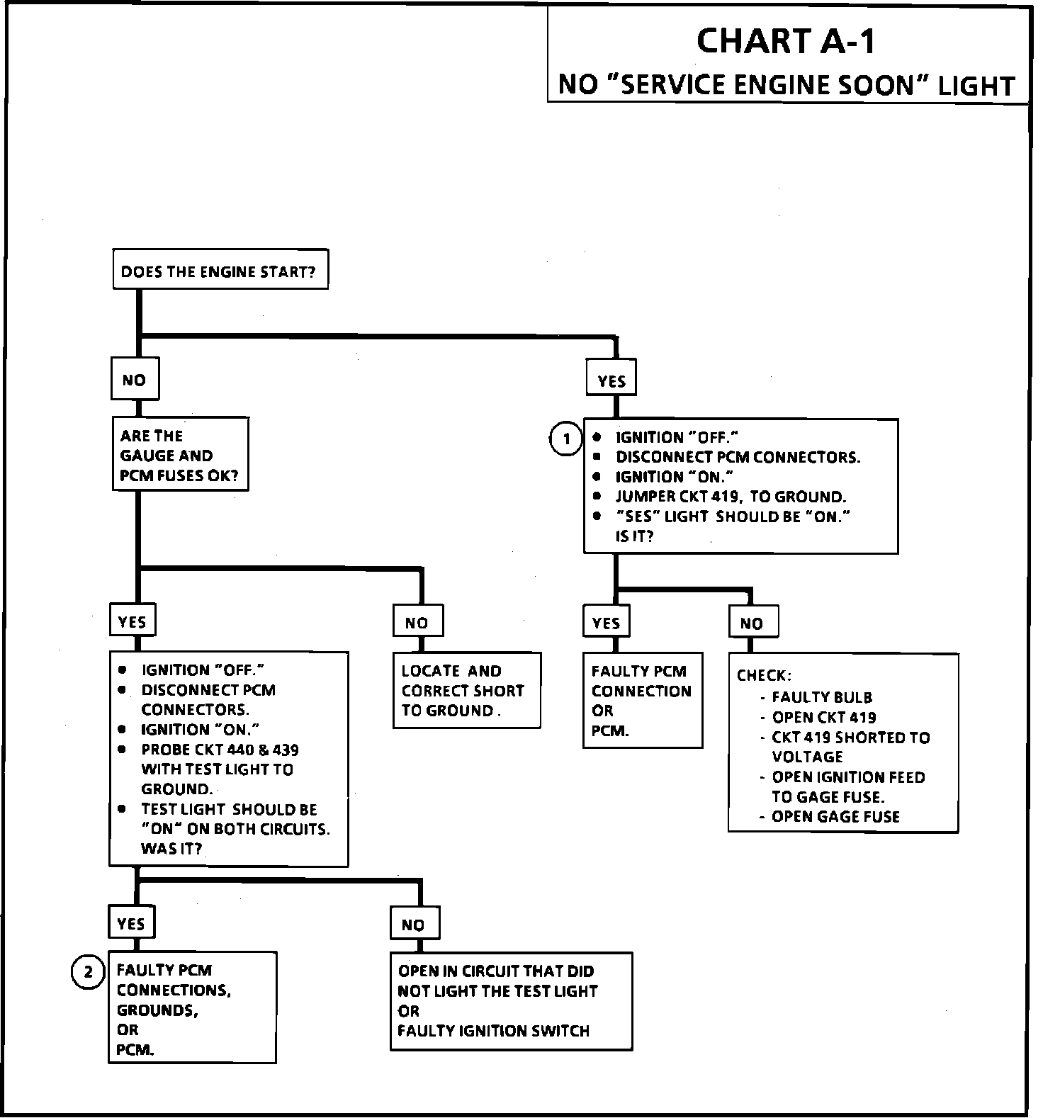 There should always be a steady "SERVICE ENGINE SOON" light when the ignition is "ON" and engine stopped. Ignition voltage is supplied to the light bulb. The PCM will control the light and turn it "ON" by providing a ground path through CKT 419.