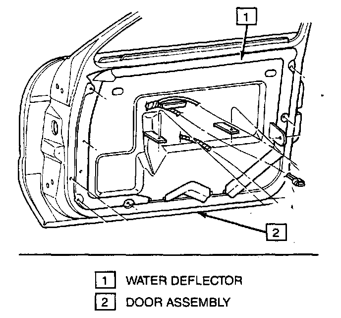 1. Water deflector to door inner panel, making sure that tabs on bottom of deflector are in slots in bottom of door inner panel.
