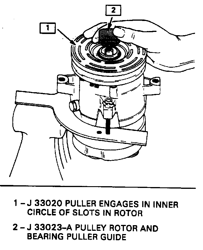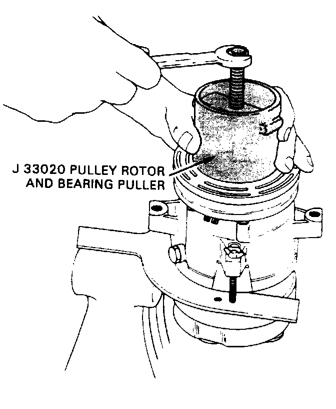 4. Hold the J 33020 puller in place arid tighten the puller screw against the puller guide to remove the pulley rotor and bearing assembly.
