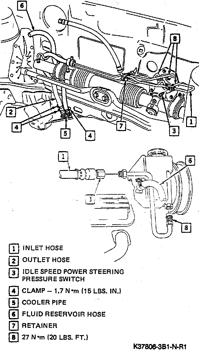 1. Idle speed power steering pressure switch to gear inlet hose (if removed).