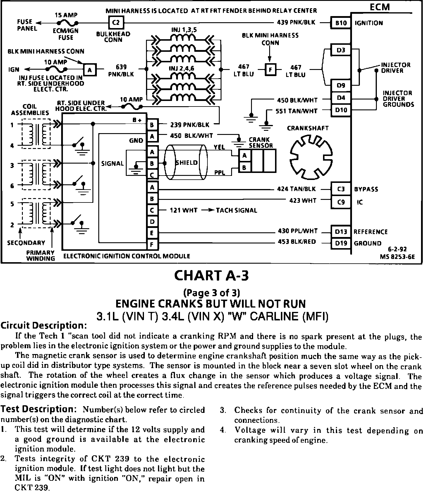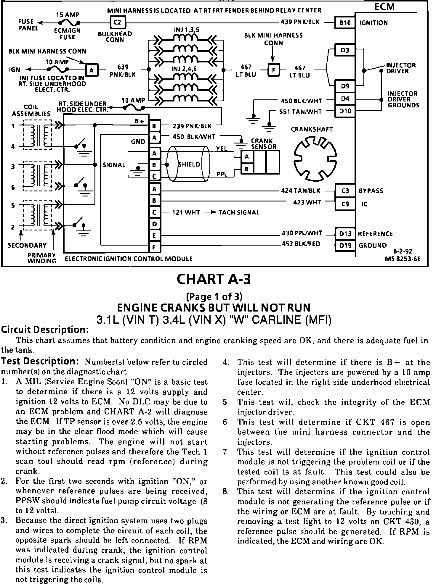 This Bulletin contains revisions to Section 6E3 of the 1991-92 "W" Carline Service Manuals The 3.1L (VIN T) and 3.4L (VIN X) Engine Cranks But Will Not Run (Chart A-3) has been revised. These revised pages will replace the current Chart A-3 pages in the following service manuals.