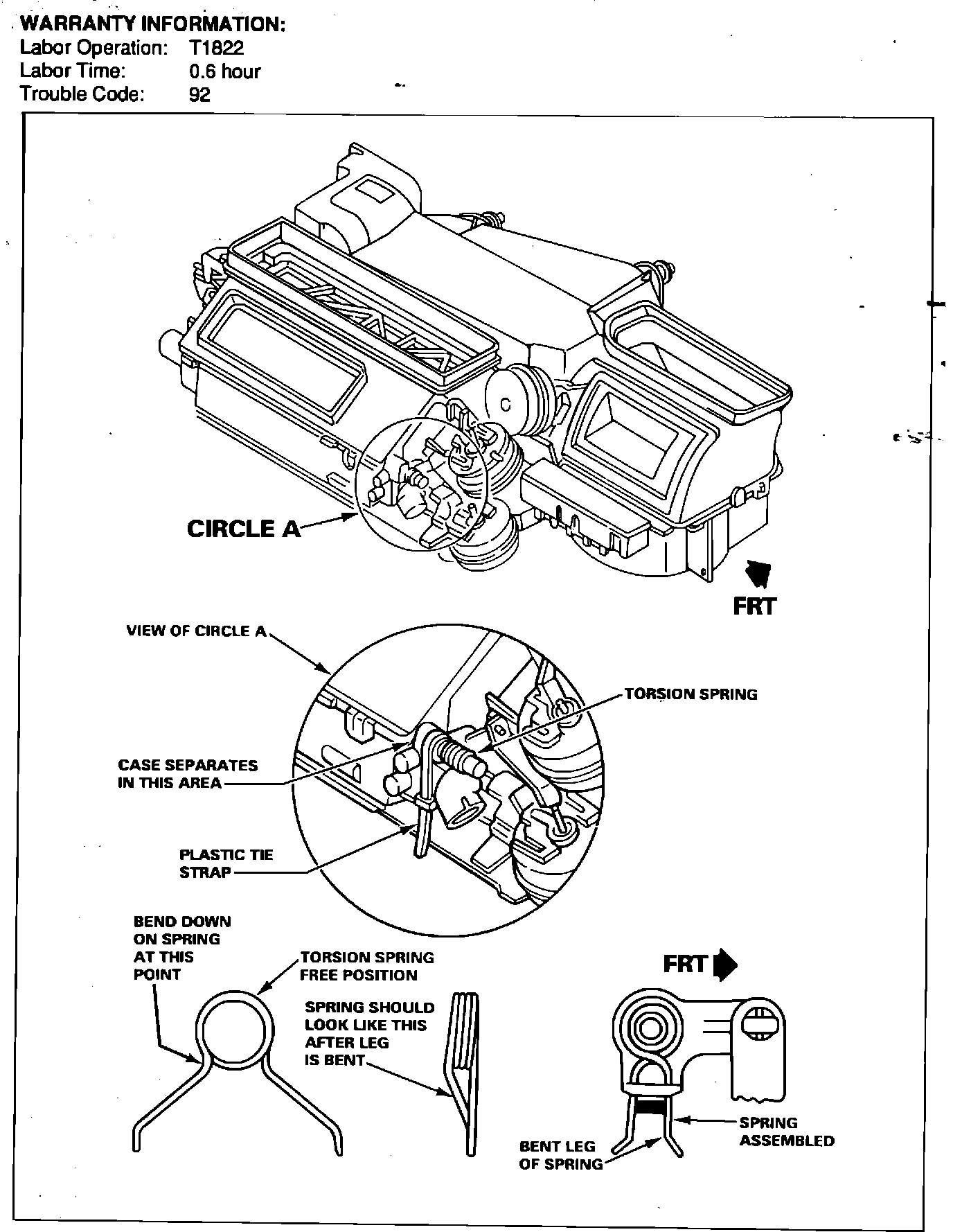 The defroster valve door may not return to the mid-position (defog). The Heater A/C module upper cover separates from the lower case, causing the torsion spring on the end of the valve door shaft to slip off the end of the shaft, or the torsion spring may slip off the shaft on its own without the case and cover separating.
