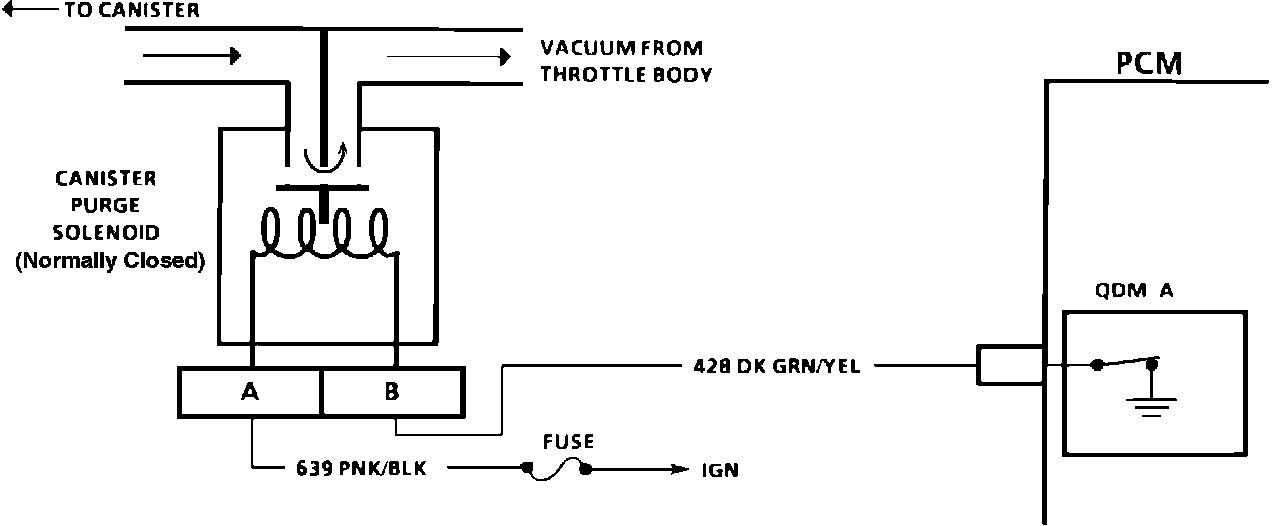 The canister purge is controlled by a solenoid that allows vacuum to purge the fuel vapor canister when energized. The PCM controls the ground to power the solenoid. If the diagnostic test terminal is grounded with the engine not running, or the following exist with the engine running, the purge solenoid is energized: