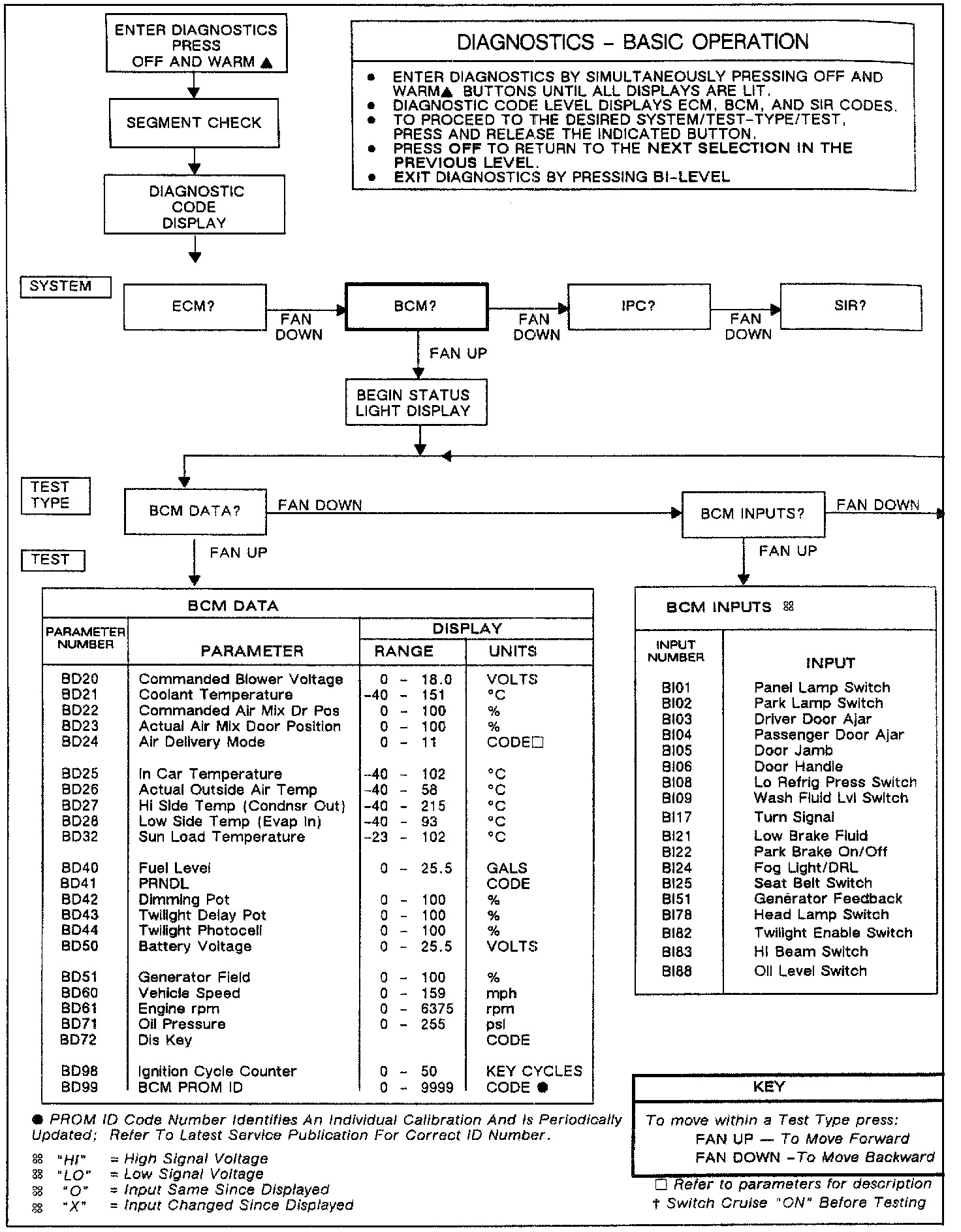 After diagnostics is entered, any trouble codes stored in computer memory will be displayed. Codes may be stored for the ECM, BCM, or SIR systems.