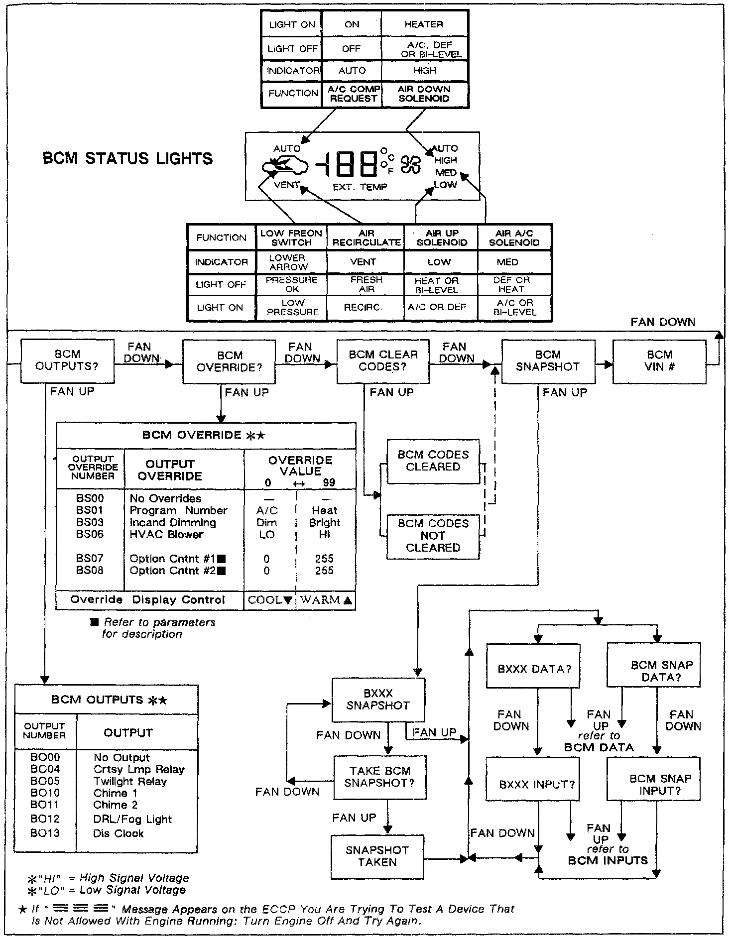 If no codes are present for a system, a NO X CODE message (with X being the system abbreviation - E, B, or R) will be displayed. If the communication line to a component is not operating, a NO X DATA message will be displayed, indicating that the BCM could not communicate with that system.