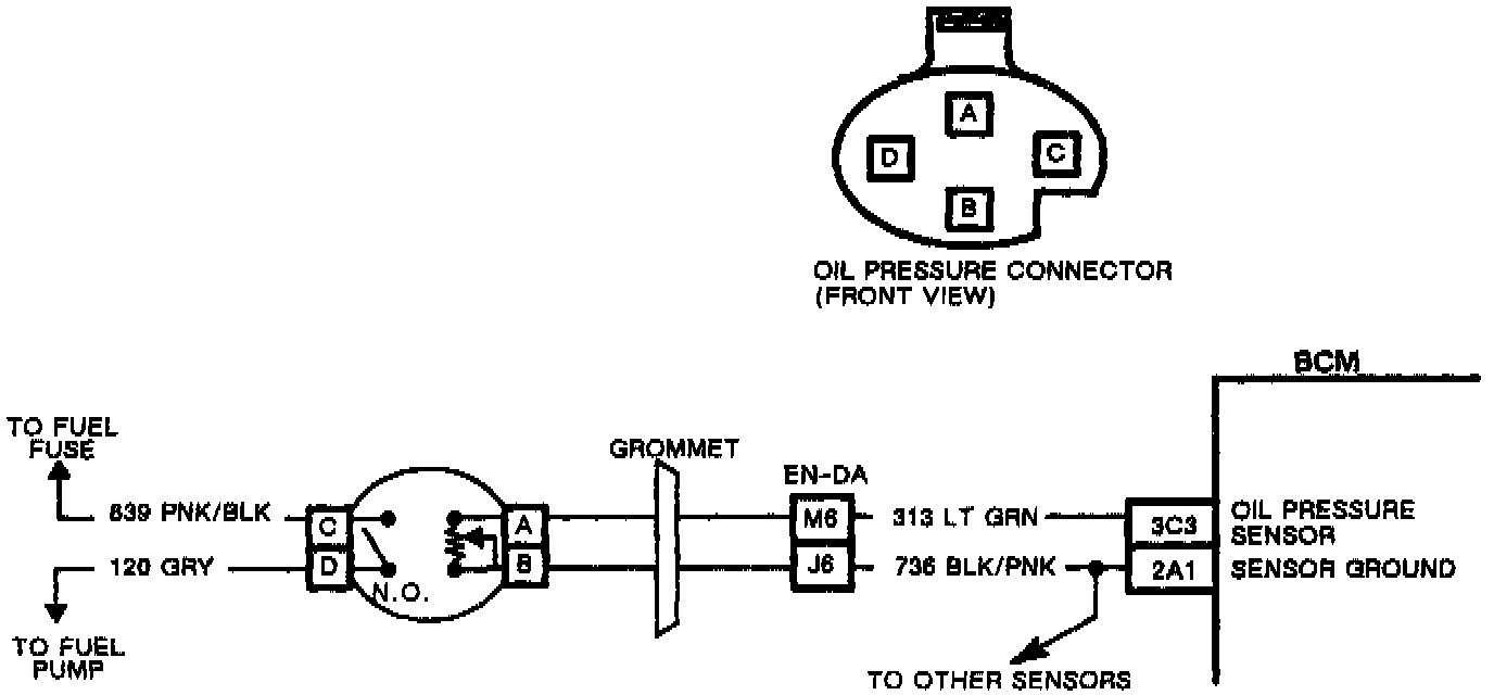 The BCM provides voltage to the oil pressure circuit, and the oil pressure sensor provides a single path to ground. The BCM supplies and internally monitors the voltage level of the circuit at pin 3C3. The sensor acts like a variable resistor, when the oil pressure is high, resistance is high, and the BCM will detect high voltage. As the oil pressure decreases so will the voltage level sensed by the BCM at pin 3C3. The BCM will then calculate the oil pressure by the amount of voltage present, and when the calculated oil pressure drops below 6 psi, and all other failure conditions have been met, the BCM will send the "OIL PRESSURE LOW" message to the IPC. The BCM will also flash the oil can next to the oil pressure gauge on the IPC and activate the medium paced chime on the chime module.