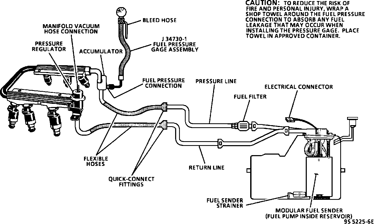 1. Use pressure gage J 34730-1. Wrap a shop towel around the fuel pressure tap to absorb any small amount of fuel leakage that may occur when installing the gage.