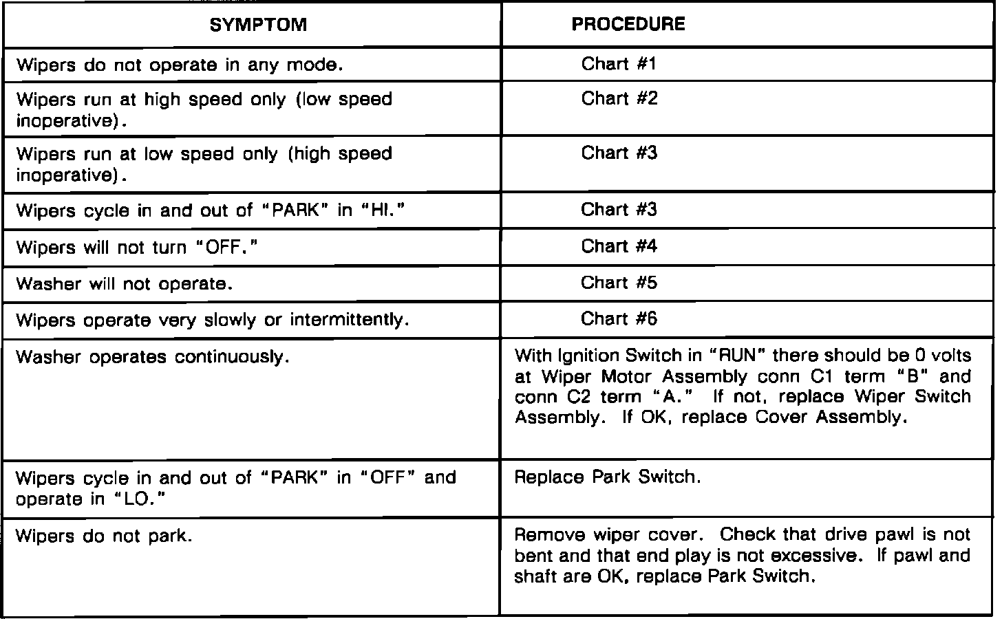 Wiper/Washer Symptom Chart: