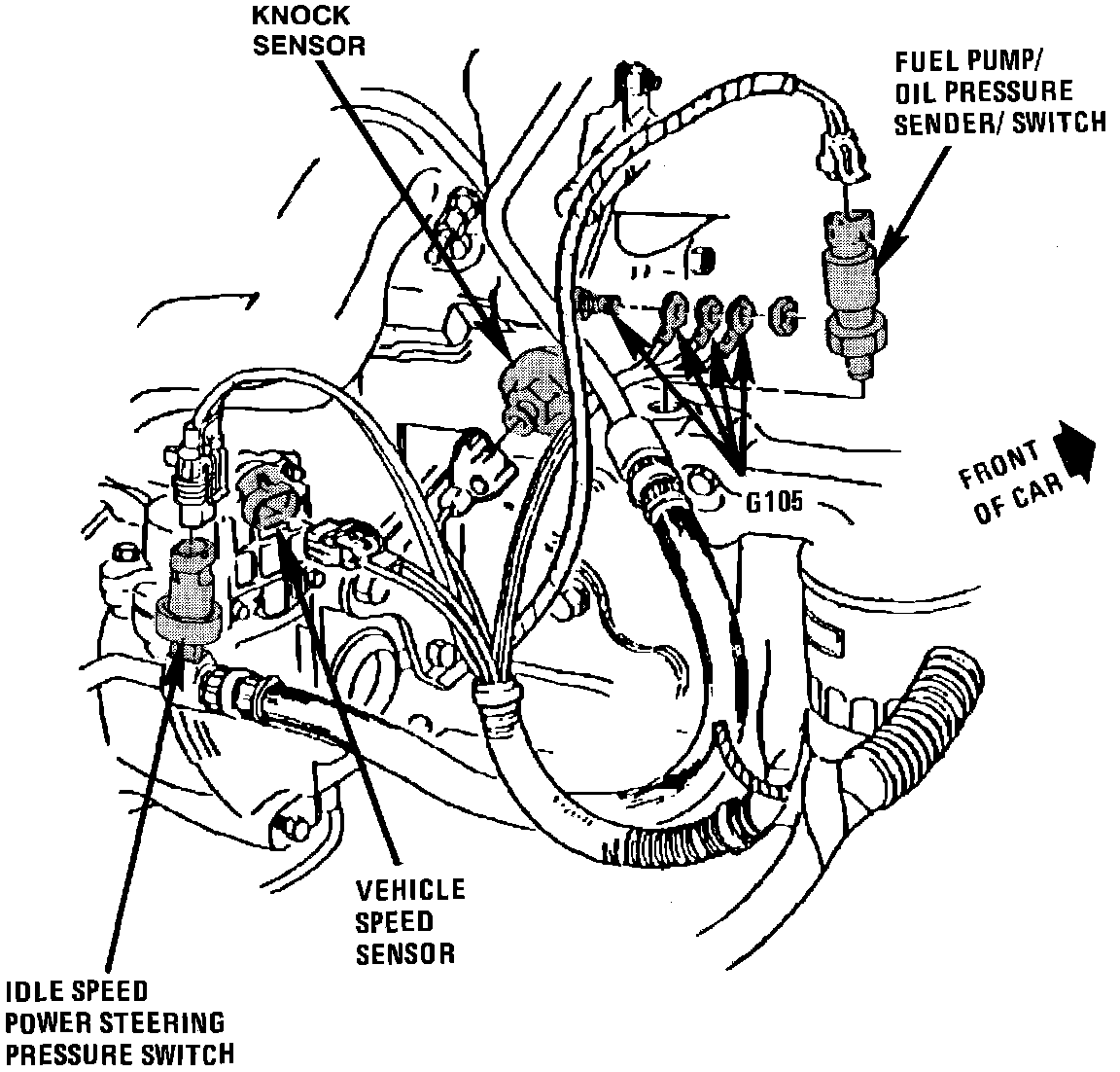 The Detonation Sensor is located in the lower RH rear of engine, below G105.