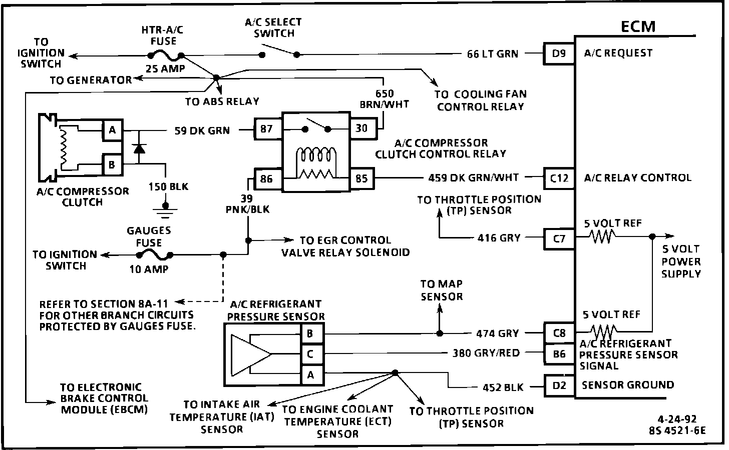 The A/C pressure sensor electrical circuit consist of a 5.0 volt reference line, a ground, and a signal wire to the ECM. The signal is a voltage that varies from approximately 0.1 volts at 0.0 psi to 4.9 volts at 450 psi or more. A problem with the A/C pressure circuits or sensor should set a Code 66 and will make the A/C compressor inoperative.
