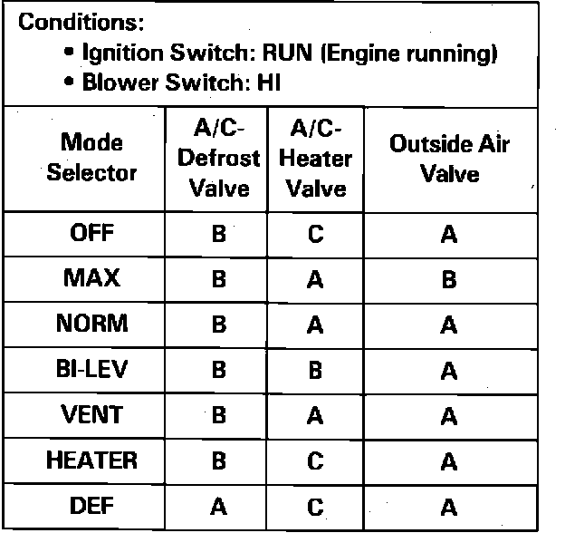 ^ If air flow does not come from the proper outlets under one or more operating modes, at least one of the air valves is not moving to the proper position.
