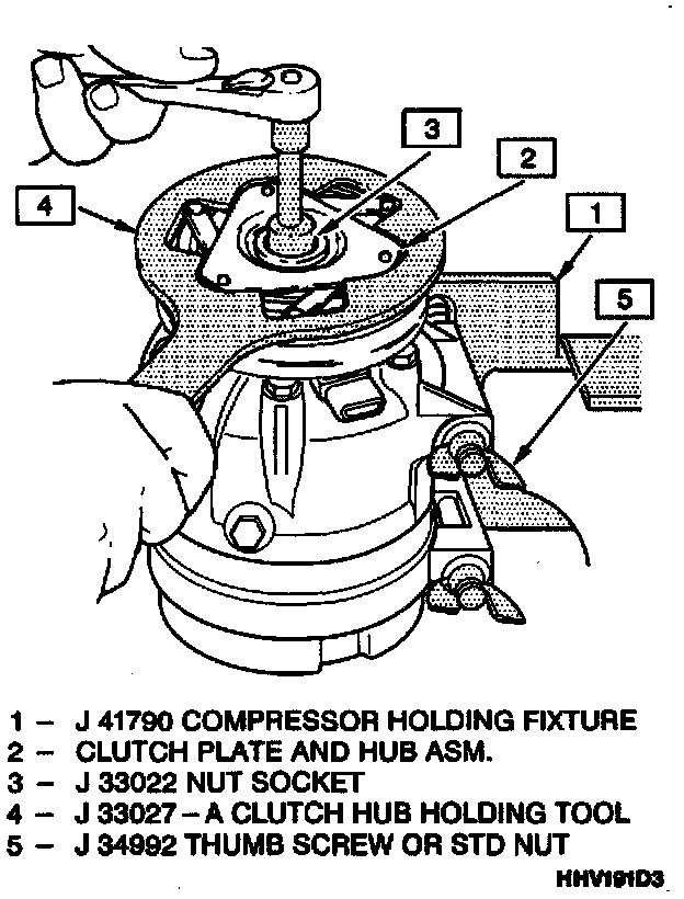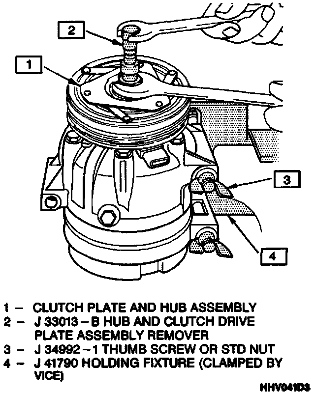 1. Clamp the holding fixture J 41790 in a vise and attach compressor to holding fixture with nuts and bolts (2).