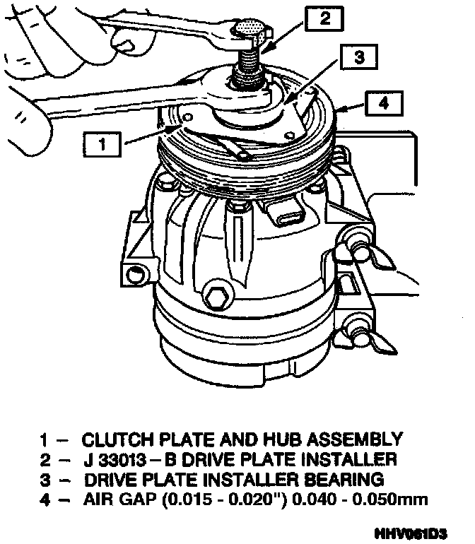 6. Hold the center screw with a wrench. Tighten the hex portion of the installer J 33013-B body to press the hub onto the shaft. Tighten the body several turns, remove the installer and check to see that the shaft key is still in place in the keyway before installing the clutch plate and hub assembly to its final position. The air gap between frictional surfaces of the clutch plate and clutch rotor should be 0.40-0.50mm (0.015-0.020").