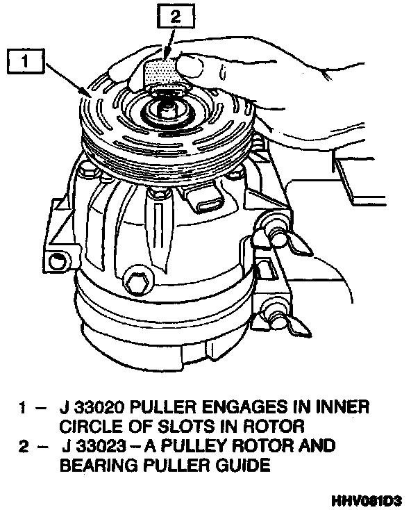 4. Hold the J 33020 puller in place and tighten the puller screw against the puller guide to remove the pulley rotor and bearing assembly.