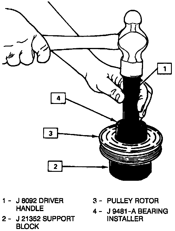 1. Place the pulley rotor on the J21352-A support block to fully support the rotor hub during bearing installation.