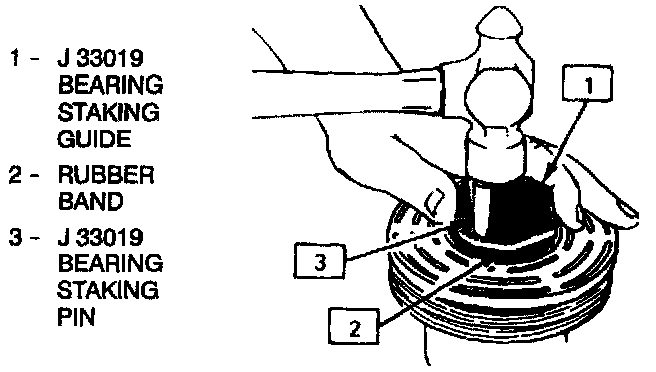 3. Place bearing staking guide J 33019-1 and bearing staking pin J33019 in the hub bore as shown in the illustration. Shift the rotor and bearing assembly on the J 21352-A support block to give full support of the hub under the staking pin location. A heavy-duty rubber band may be used to hold the stake pin in the guide, and the stake pin should be properly positioned in the guide after each impact on the pin.