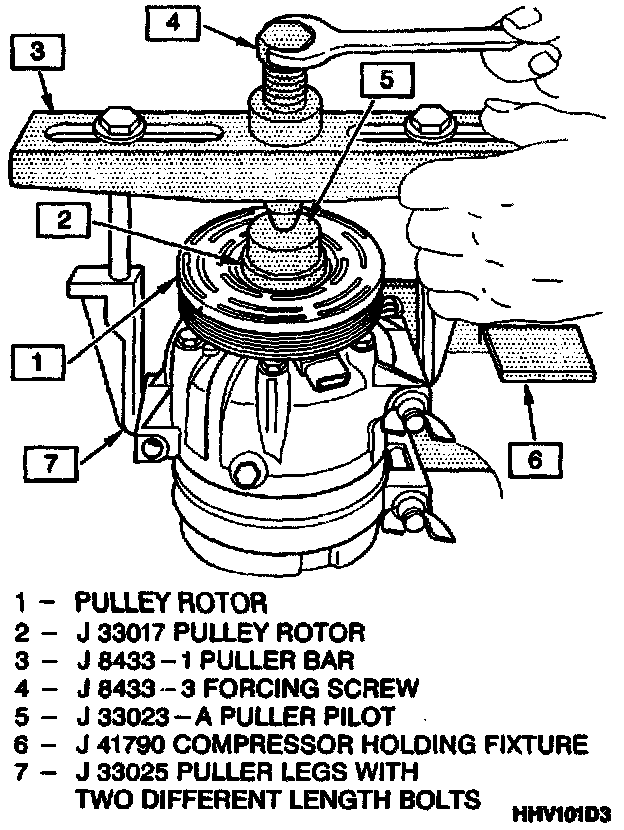 8. Tighten the center screw in the J 8433-1 puller crossbar to force the pulley rotor and bearing assembly onto the compressor front head. Should the J 33017 pulley rotor and bearing installer slip off direct in-line contact with the inner face of the bearing, loosen the J 8433-3 center forcing screw and realign the installer and pilot so that the J 33017 installer will properly clear the front head.
