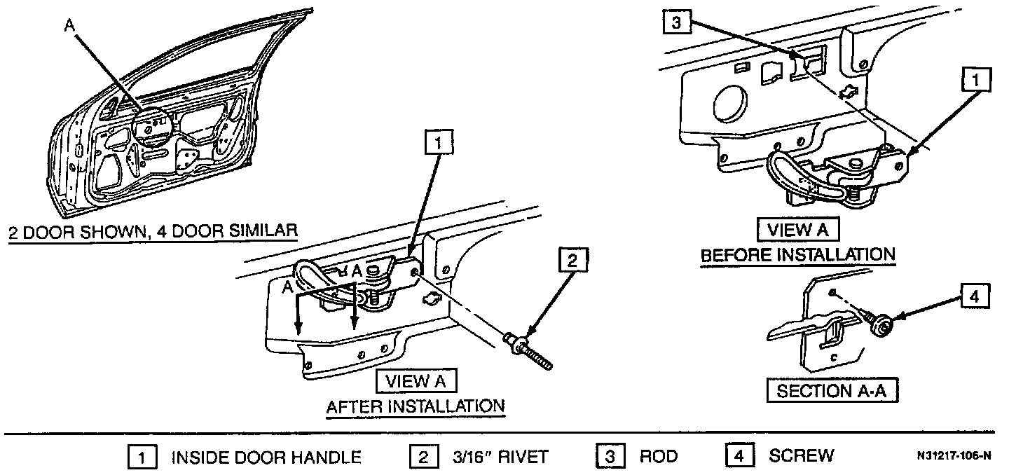 All inside remote handles are the pull-in type. All remote handles actuate the door lock through a connecting rod. Remote handles are attached to the door inner panel with one rivet and one screw.