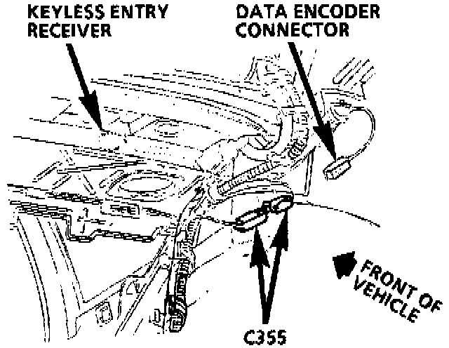 The keyless entry receiver programming connector, also referred to as the data encoder connector, is located on the RH side of the trunk, above the wheelhouse.