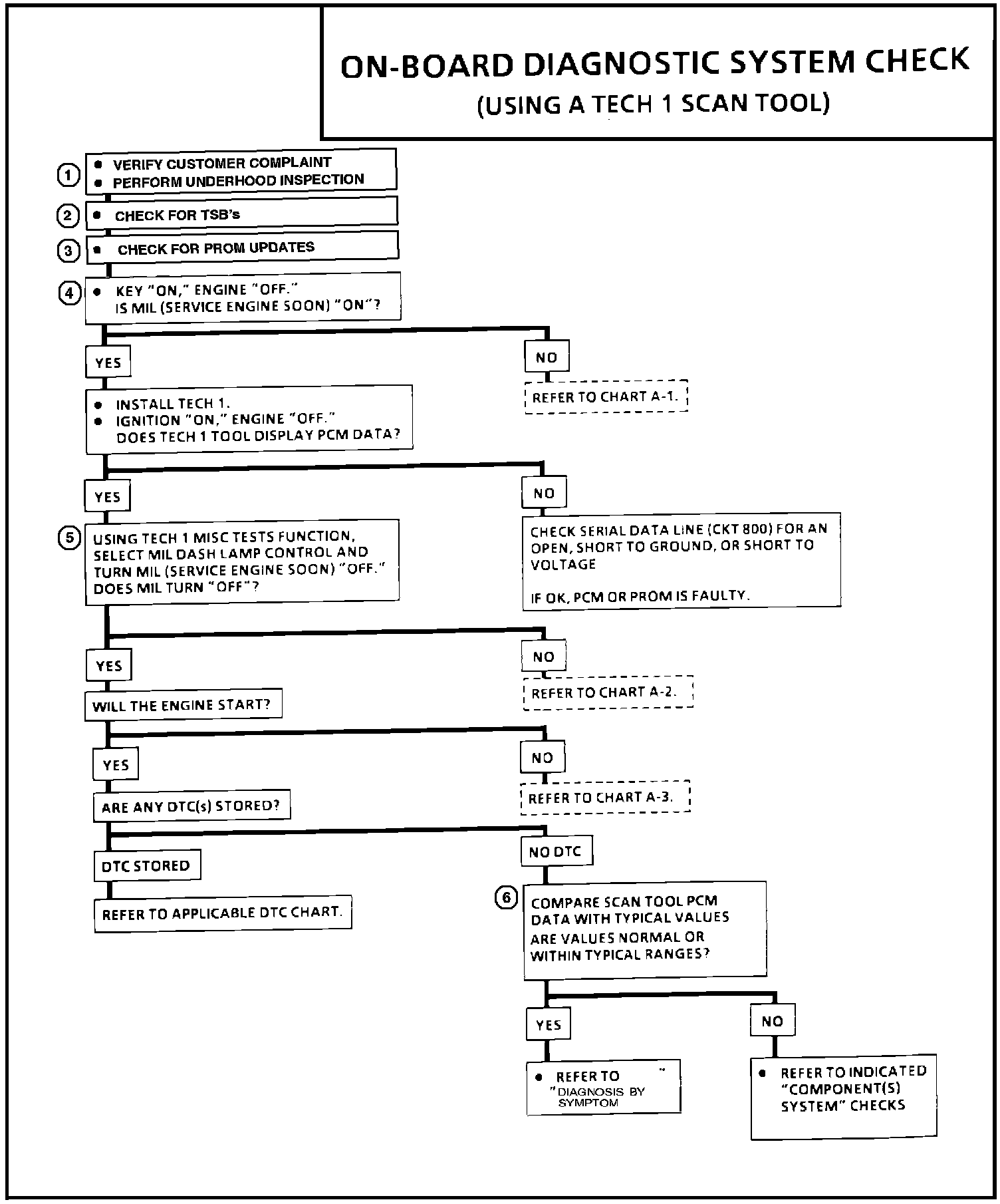 b. Since this is the starting point for all diagnostic procedures or finding the cause of an emissions test failure, always begin here and always follow the flow chart as directed.