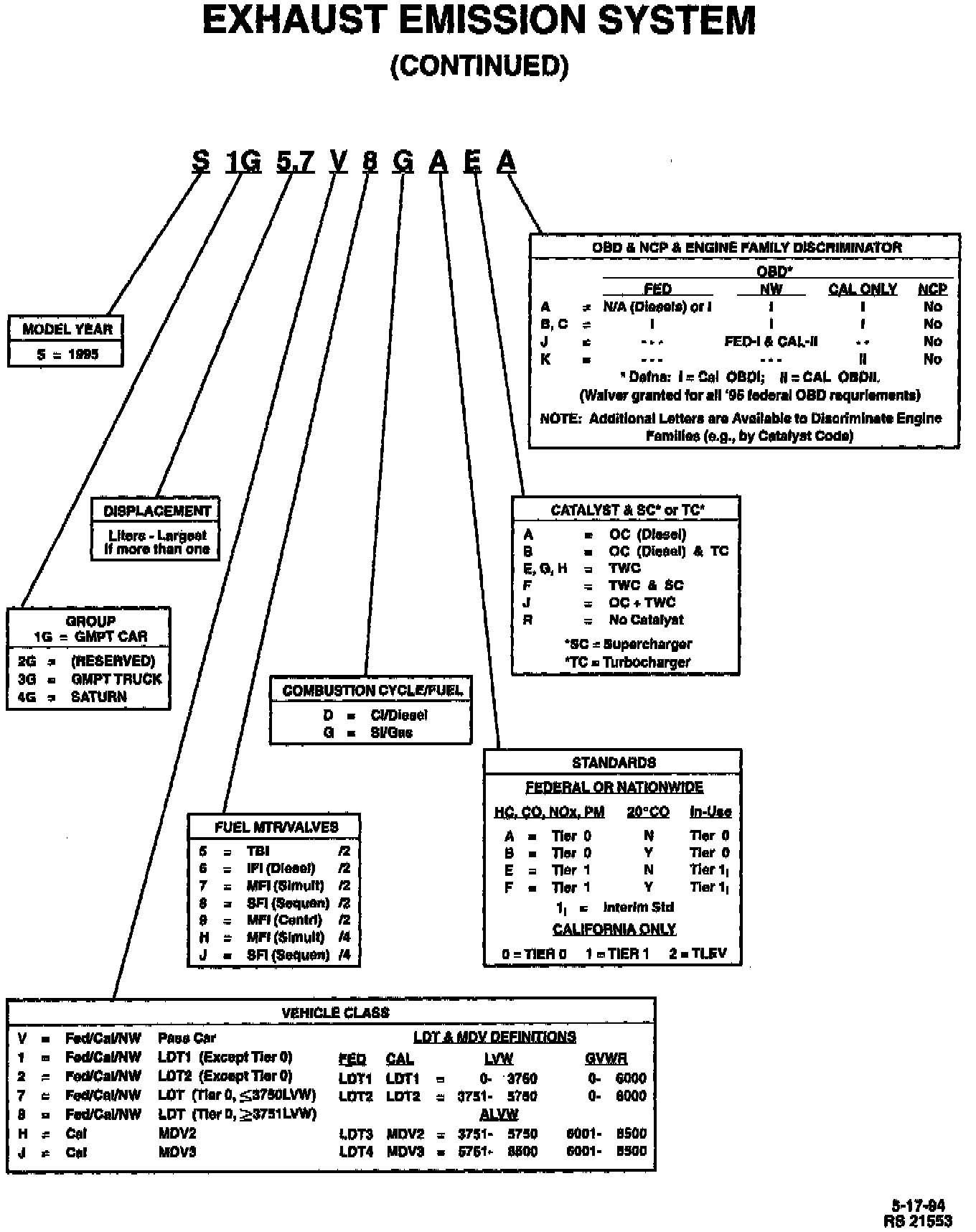 The underhood "Vehicle Emissions Control Information" label, a sample of which is located in the accompanying image, contains important emission specifications and setting procedures. In the upper left corner is exhaust emission information which identifies the year, the manufacturing division of the engine, the displacement of the engine in liters the class of vehicle, and type of fuel metering. The label also contains an illustrated emission components and vacuum hose schematic.