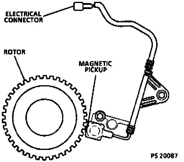 This device contains a permanent magnet surrounded by a coil of wire producing a magnetic field which is interrupted by rotor teeth cut into the outside diameter of the forward clutch housing. As the serrations interrupt the magnetic field an AC voltage is generated in the circuit. This device is used to provide an input speed signal to the control module.