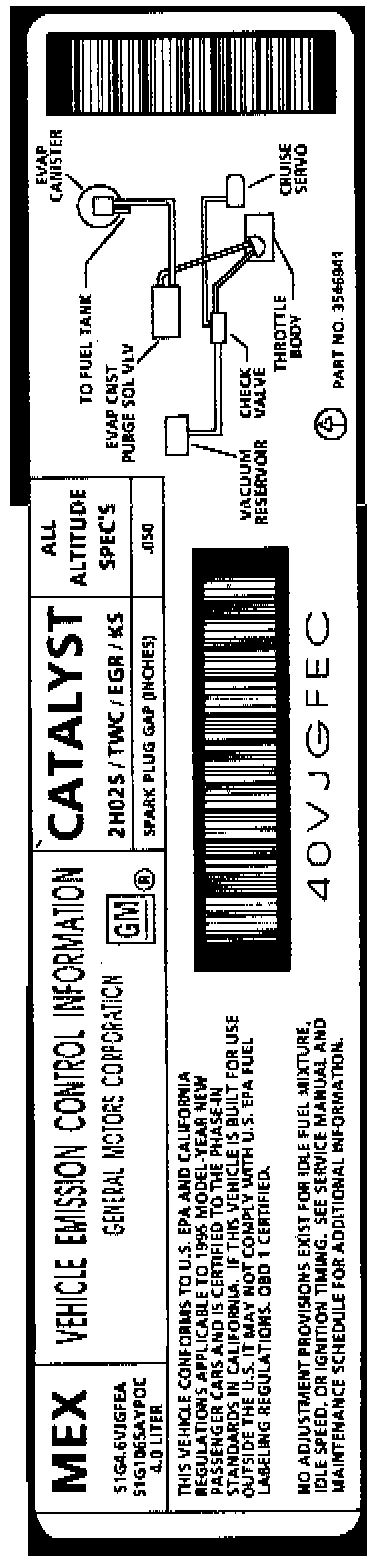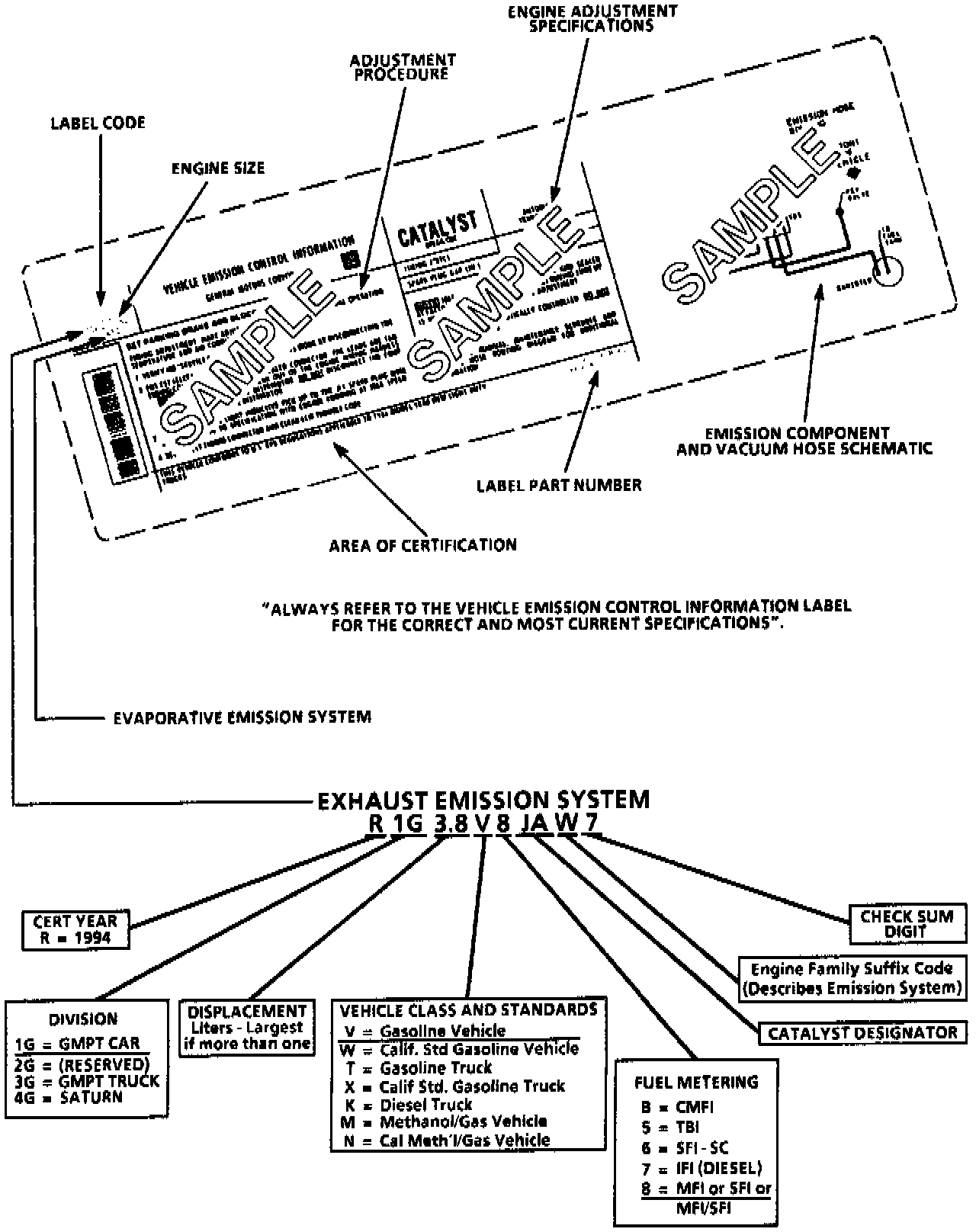 The underhood "Vehicle Emissions Control Information" label, a sample of which is located in the accompanying image, contains important emission specifications and setting procedures. In the upper left corner is exhaust emission information which identifies the year, the manufacturing division of the engine, the displacement of the engine in liters the class of vehicle, and type of fuel metering. The label also contains an illustrated emission components and vacuum hose schematic.