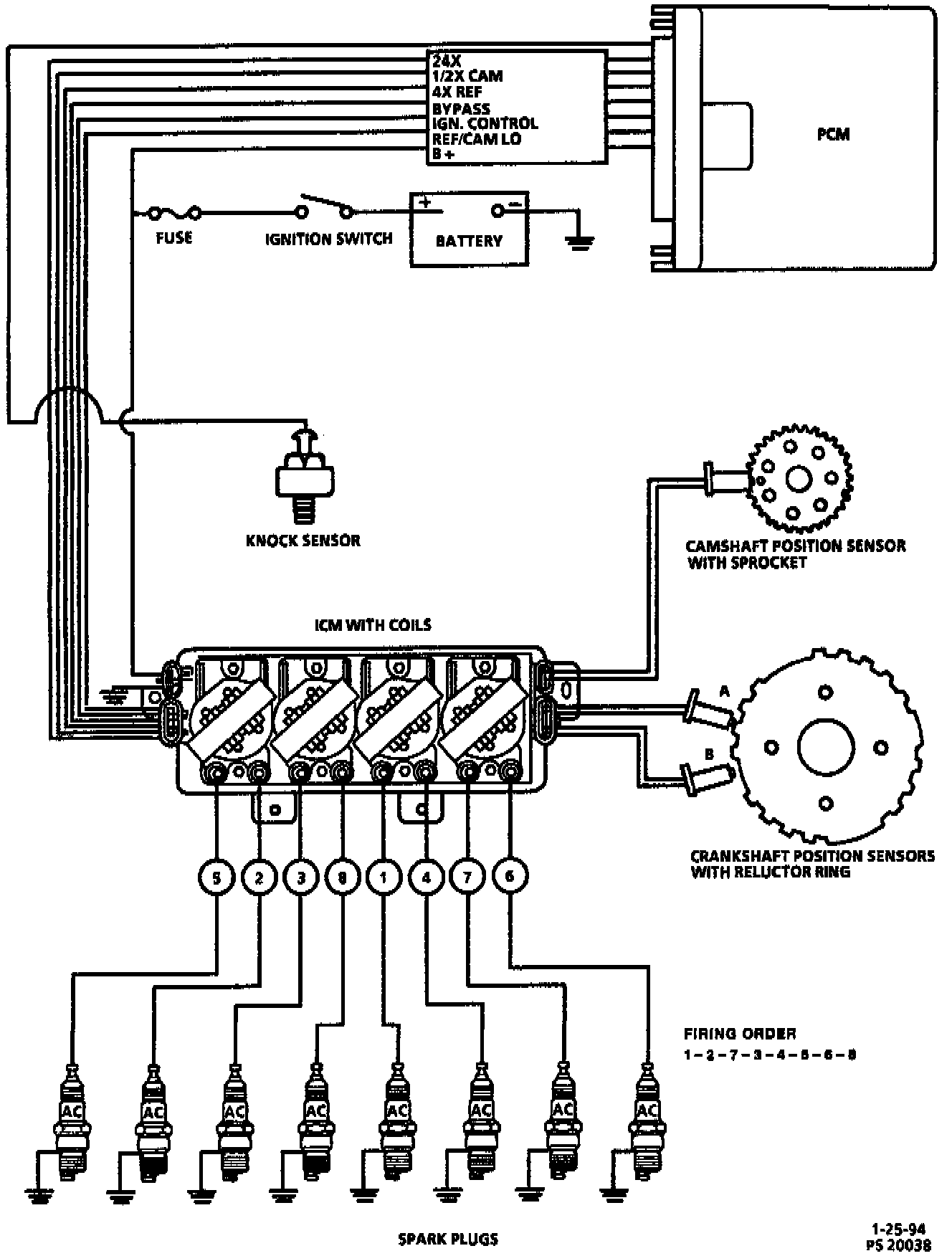 The Premium V ignition control system does not use a conventional distributor or a single ignition coil. In this ignition system. Each coil is connected to a spark plugs on "companion" cylinders, i.e., on top dead center at the same time (1-4, 2-5, 6-7, and 3-8). One cylinder is on its compression stroke when the other one is on its exhaust stroke.