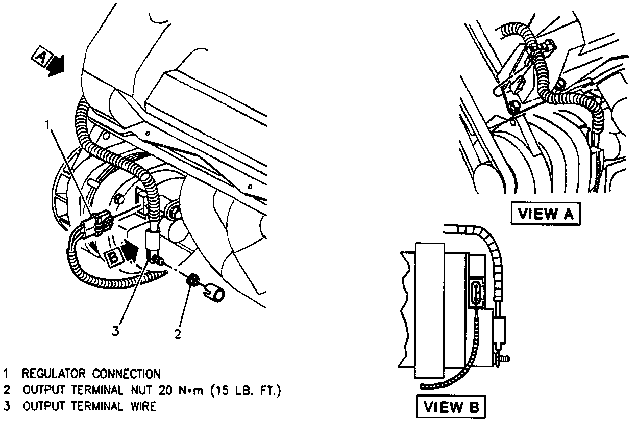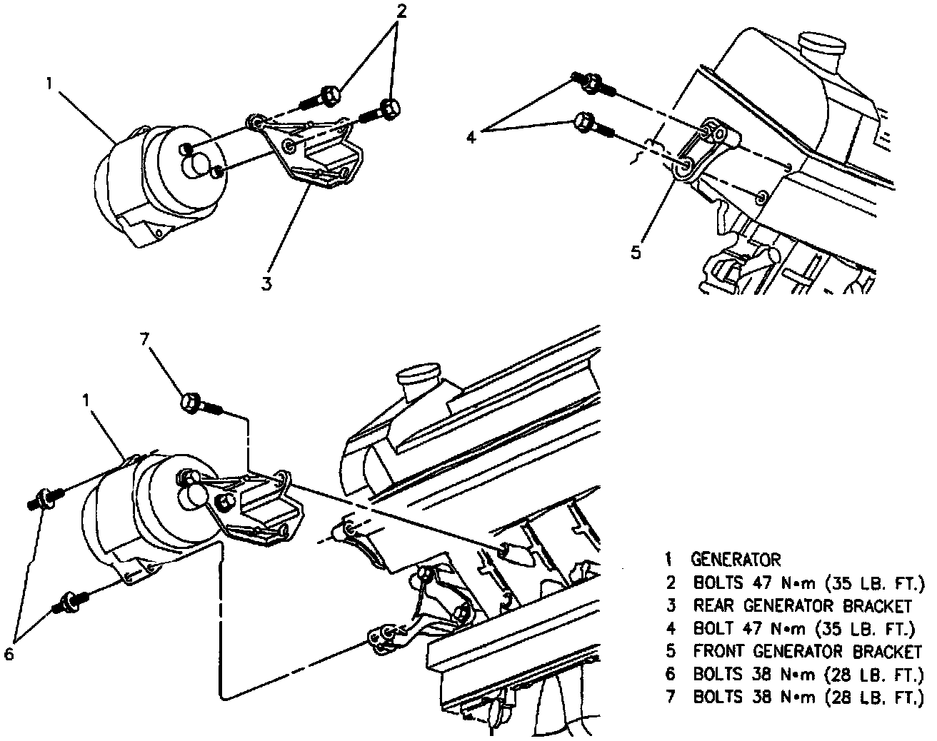 6. Top alternator bolts, disconnect cable and regulator connector.