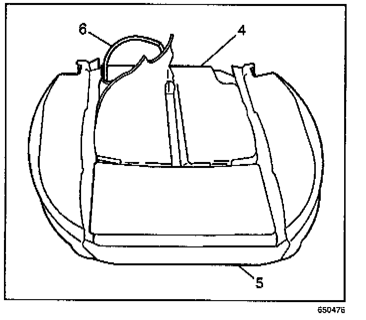 3. Insert the seat heat element harness (6) through a hole located in the right rear corner of the seat cushion pad (5).