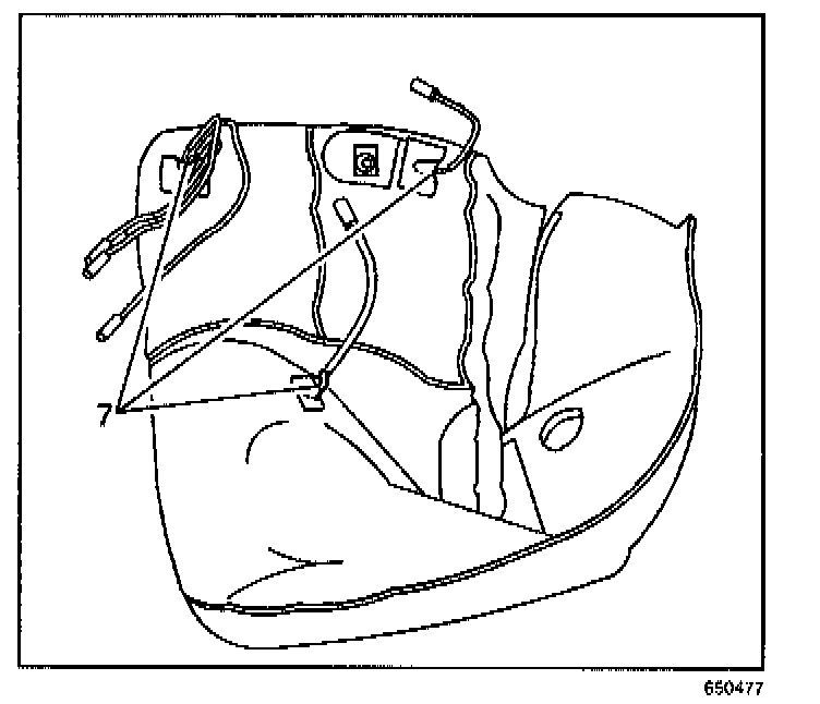 5. Cut off all of the old heat element harness (7) from the seat cushion trim cover.