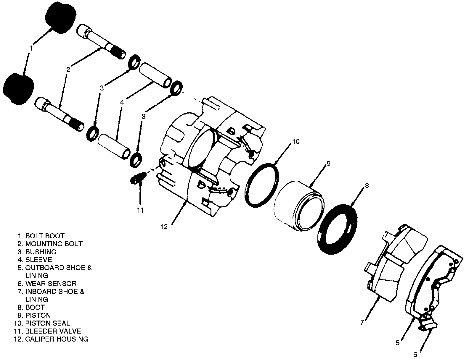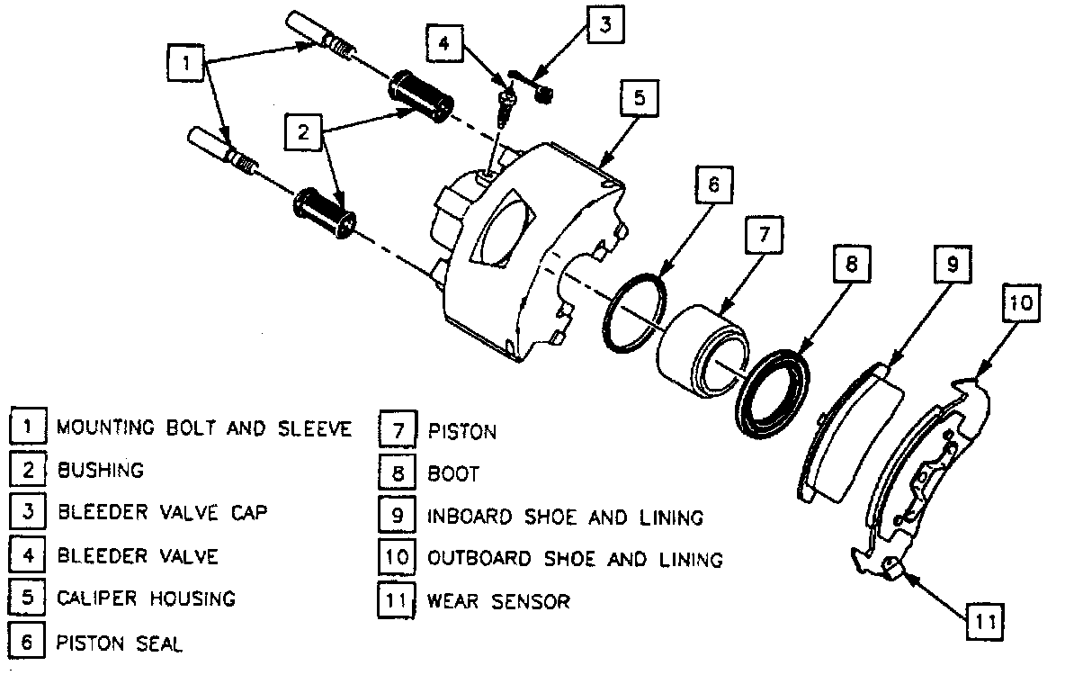 The caliper has a single piston and is mounted to the support bracket by two mounting bolts, Figs. 1 through 4. The caliper assembly slides on the two mounting bolts.