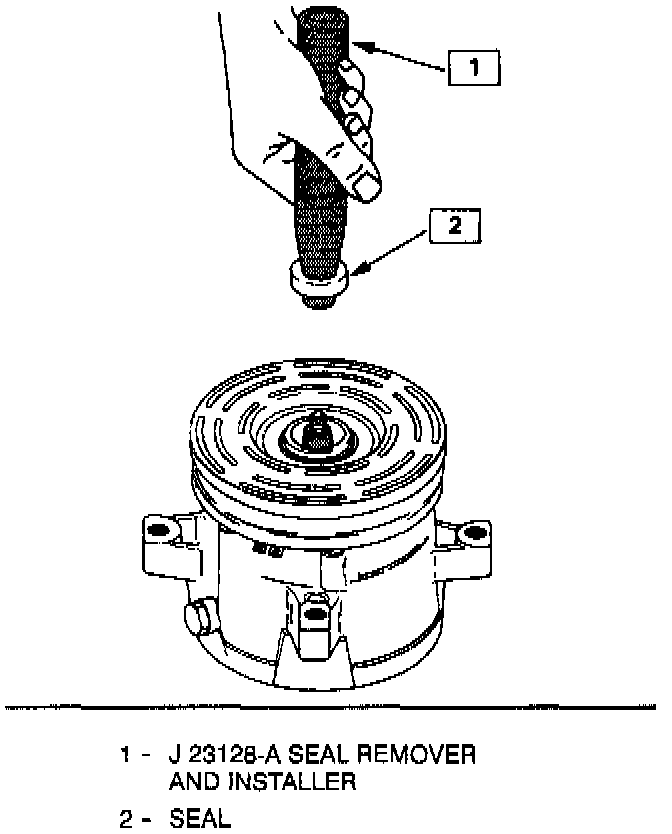6. Fully engage the knurled tangs of seal remover-installer J2312-A into the recessed portion of the seal by turning the handle clockwise. Remove the seal from the compressor with a rotary-pulling motion. Discard the seal. The handle should be hand-tightened securely. Do not use a wrench or pliers.