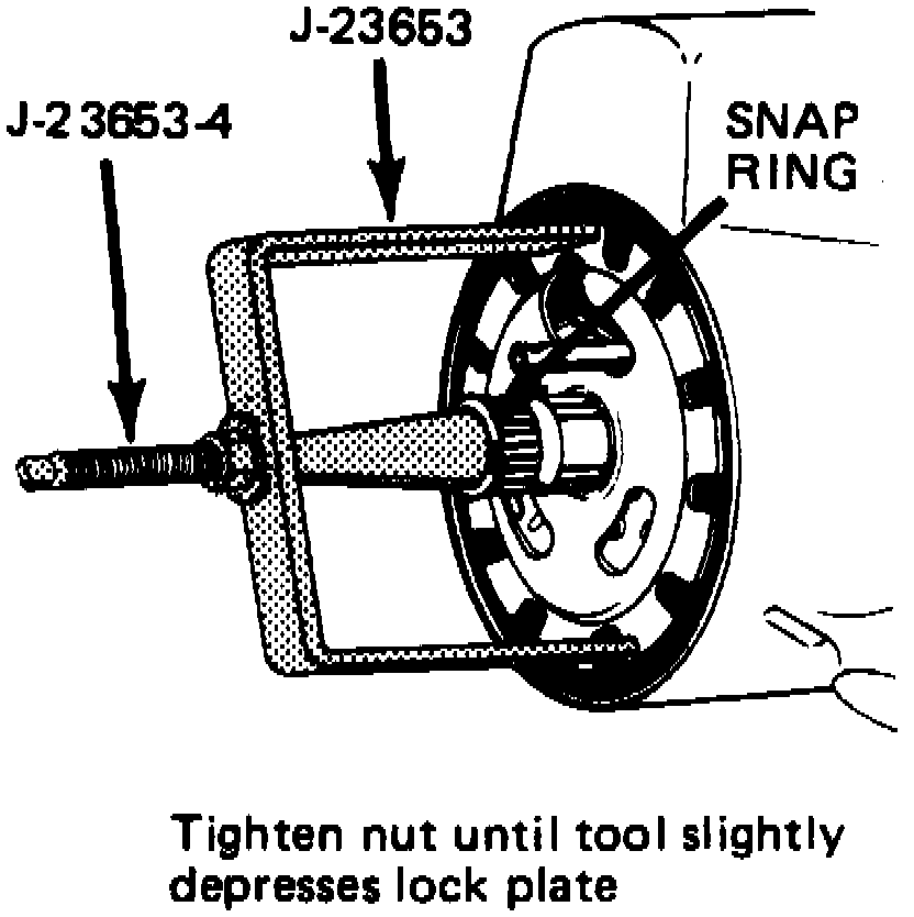 4. Using lock plate compressing tool No. J-23653, or equivalent, compress lock plate, and pry snap ring from groove on shaft, Fig. 6.Slowly release lock plate compressing tool, then remove tool and lock plate from shaft end.