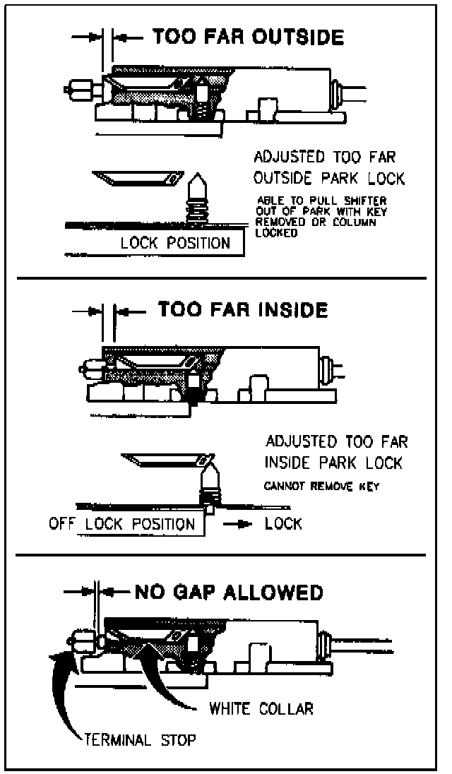 4. With body housing still attached to shift control mounting bracket, adjust outer cable conduit to obtain proper location for white plastic housing in the ignition switch, Fig. 3.