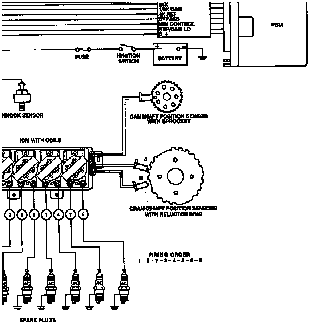 ^ The camshaft position sensor provides the IC module with cylinder #1 firing order information, which the PCM uses for sequential fuel injection.
