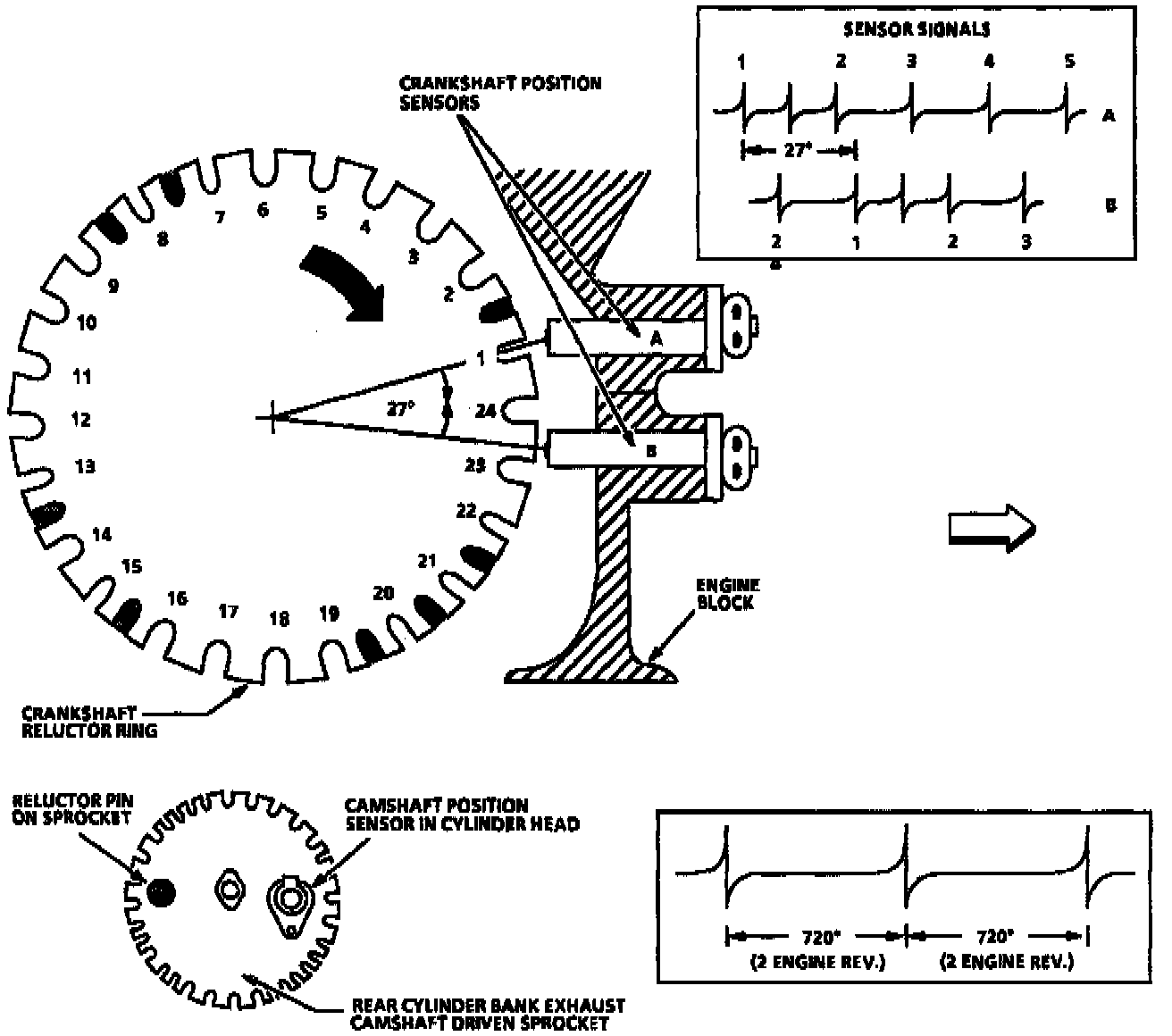 ^ Because of the physical location of the two crankshaft position sensors, the signal of "B" lags the signal of "A" by 27 of crankshaft revolution.