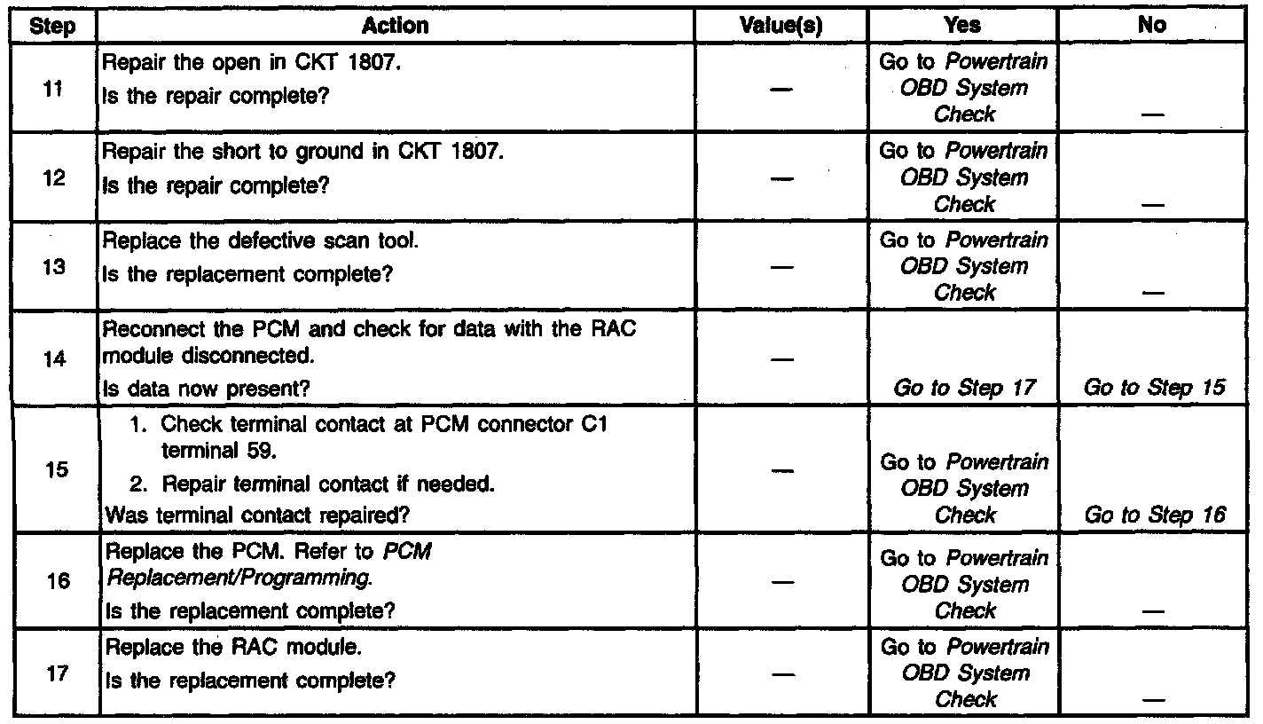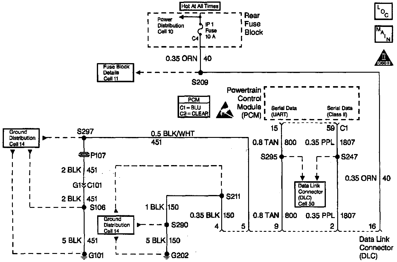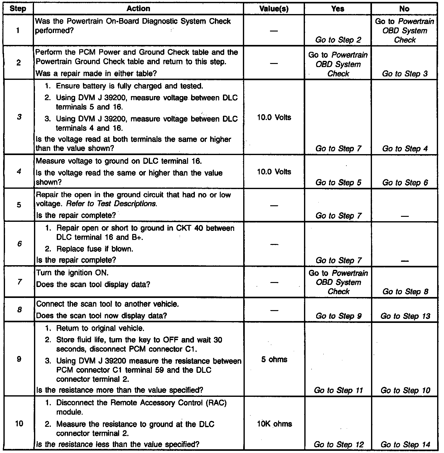 The Data Link Connector check is used to identity the cause of an inoperative scan tool. Possible faults include scan tool non-power up and lack of communication between the scan tool and the PCM. The DLC supplies power to the scan tool through CKT 40 to terminal 16. The ground to the scan tool is supplied through CKT 51 to terminal 5. The serial data (communication) is supplied to the scan tool through CKT 1807 to terminal 2.