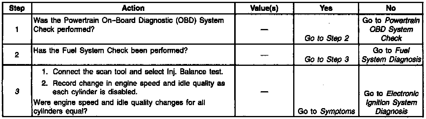 Refer to Injectors 1-4-6-7 wiring view and Injectors 2-3-5-8 wiring view for an electrical diagram of this circuit. The Power Balance Check compares the performance of each of the cylinder by using the PCM to shut off fuel injection. This measures the performance of each cylinder by the amount of RPM drop caused by that cylinder not producing a power stroke. If proper fuel delivery has been determined, then a cylinder that does not show good performance (RPM drop) indicates either an ignition or mechanical problem.