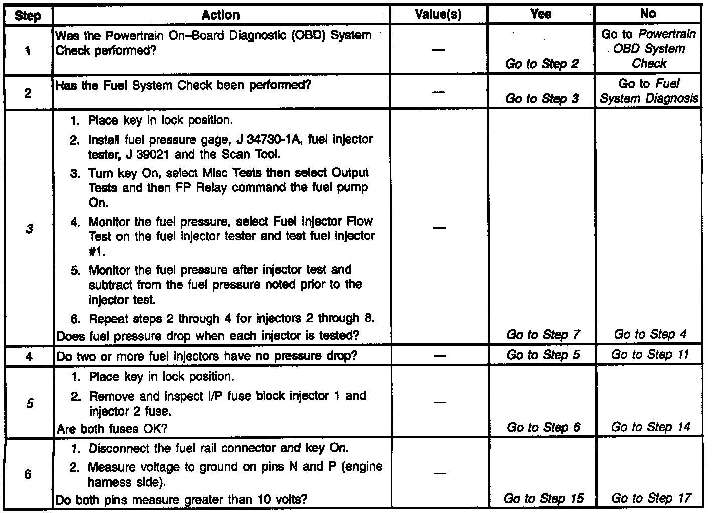 This Check compares the fuel pressure drop when each injector is pulsed for a set amount of time. Since each injector is pulsed the same, the fuel pressure drop for each injector should be approximately the same. Suspect fuel injectors can be identified by either too high or too low fuel pressure drop. This check also determines if the voltage drop of the injector is within specification. Injector voltage drop out of specification can cause driveability conditions that are intermittent or that do not show up during an injector flow check. This chart requires J 34730-1A Fuel Pressure Gage, J 39200 Voltmeter, and J 39021 Fuel Injector Tester.