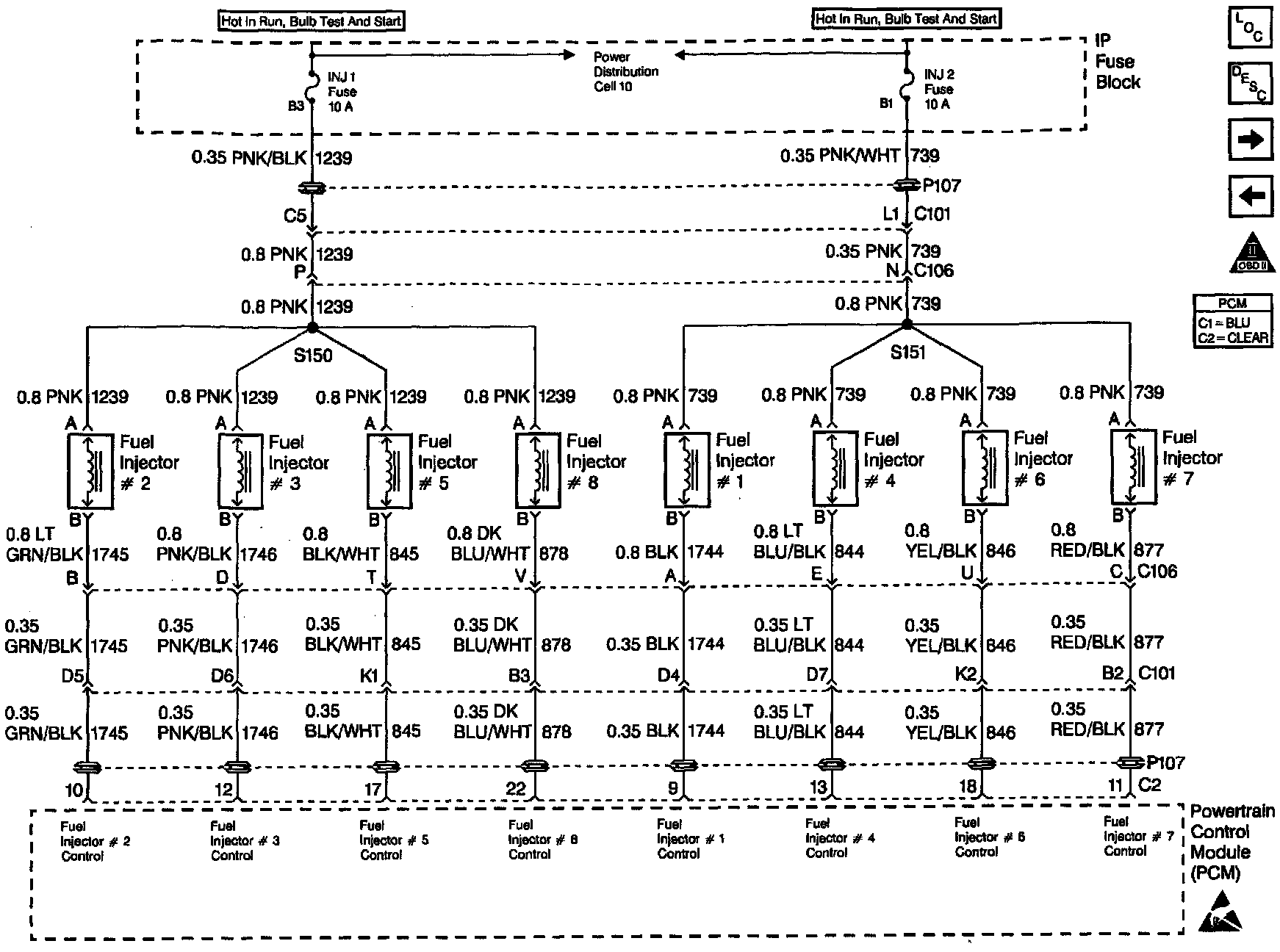 5. Checking if a fuse was open causing either injectors 2,3,5,8, or 1,4,6 and 7 not to operate.